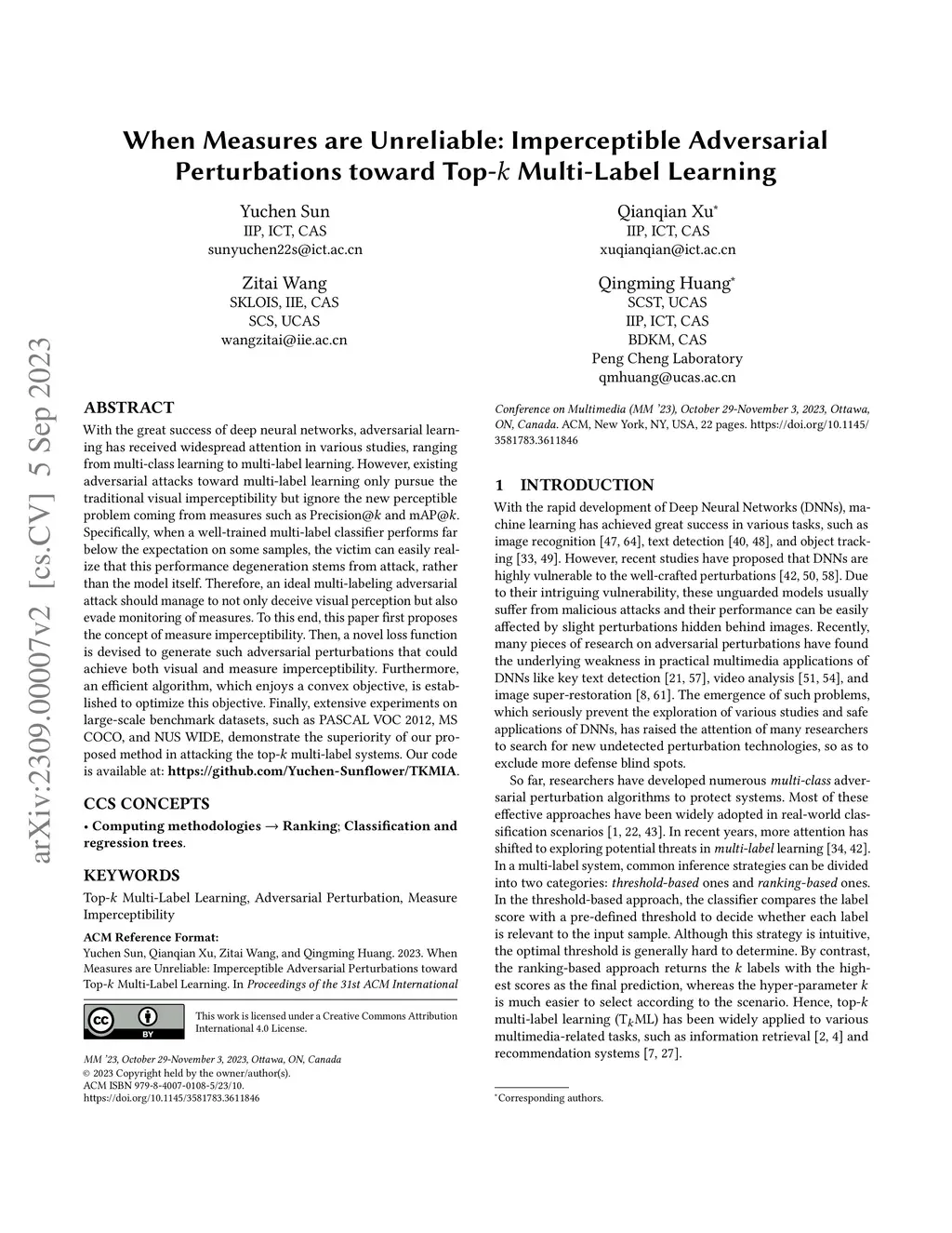 With the great success of deep neural networks, adversarial learning has received widespread attention in various studies, ranging from multi-class learning to multi-label learning. However, existing adversarial attacks toward multi-label learning only pursue the traditional visual imperceptibility but ignore the new perceptible problem coming from measures such as Precision@ and mAP@. Specifically, when a well-trained multi-label classifier performs far below the expectation on some samples, the victim can easily realize that this performance degeneration stems from attack, rather than the model itself. Therefore, an ideal multi-labeling adversarial attack should manage to not only deceive visual perception but also evade monitoring of measures. To this end, this paper first proposes the concept of measure imperceptibility. Then, a novel loss function is devised to generate such adversarial perturbations that could achieve both visual and measure imperceptibility. Furthermore, an efficient algorithm, which enjoys a convex objective, is established to optimize this objective. Finally, extensive experiments on large-scale benchmark datasets, such as PASCAL VOC 2012, MS COCO, and NUS WIDE, demonstrate the superiority of our proposed method in attacking the top- multi-label systems.