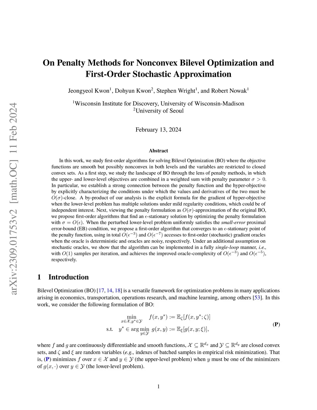 In this work, we study first-order algorithms for solving Bilevel Optimization (BO) where the objective functions are smooth but possibly nonconvex in both levels and the variables are restricted to closed convex sets. As a first step, we study the landscape of BO through the lens of penalty methods, in which the upper- and lower-level objectives are combined in a weighted sum with penalty parameter . In particular, we establish a strong connection between the penalty function and the hyper-objective by explicitly characterizing the conditions under which the values and derivatives of the two must be -close. A by-product of our analysis is the explicit formula for the gradient of hyper-objective when the lower-level problem has multiple solutions under minimal conditions, which could be of independent interest. Next, viewing the penalty formulation as -approximation of the original BO, we propose first-order algorithms that find an -stationary solution by optimizing the penalty formulation with . When the perturbed lower-level problem uniformly satisfies the small-error proximal error-bound (EB) condition, we propose a first-order algorithm that converges to an -stationary point of the penalty function, using in total and accesses to first-order (stochastic) gradient oracles when the oracle is deterministic and oracles are noisy, respectively. Under an additional assumption on stochastic oracles, we show that the algorithm can be implemented in a fully {\it single-loop} manner, i.e., with samples per iteration, and achieves the improved oracle-complexity of and , respectively.