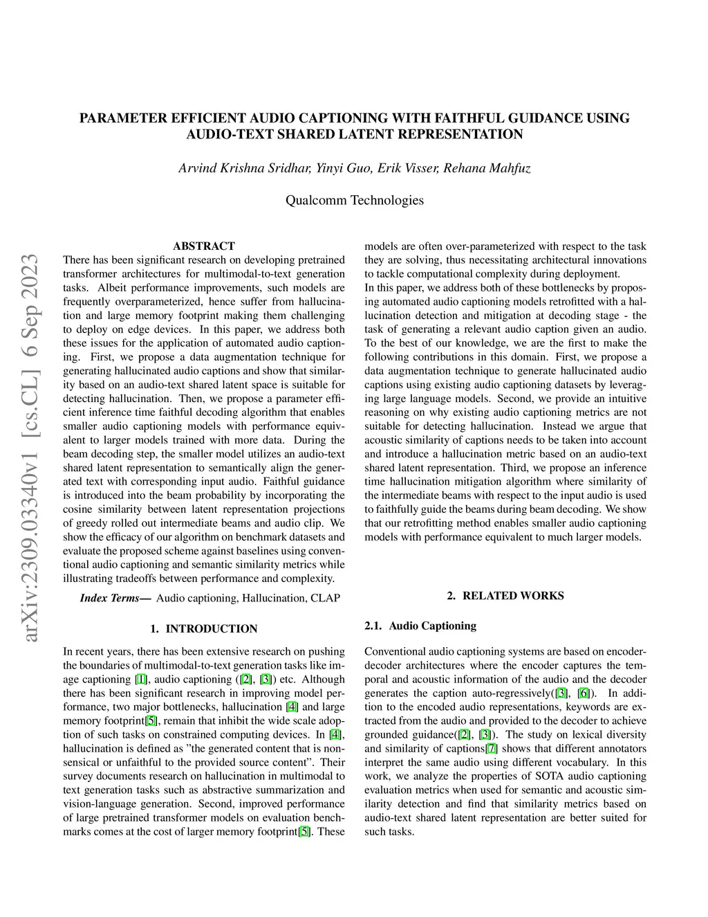 There has been significant research on developing pretrained transformer architectures for multimodal-to-text generation tasks. Albeit performance improvements, such models are frequently overparameterized, hence suffer from hallucination and large memory footprint making them challenging to deploy on edge devices. In this paper, we address both these issues for the application of automated audio captioning. First, we propose a data augmentation technique for generating hallucinated audio captions and show that similarity based on an audio-text shared latent space is suitable for detecting hallucination. Then, we propose a parameter efficient inference time faithful decoding algorithm that enables smaller audio captioning models with performance equivalent to larger models trained with more data. During the beam decoding step, the smaller model utilizes an audio-text shared latent representation to semantically align the generated text with corresponding input audio. Faithful guidance is introduced into the beam probability by incorporating the cosine similarity between latent representation projections of greedy rolled out intermediate beams and audio clip. We show the efficacy of our algorithm on benchmark datasets and evaluate the proposed scheme against baselines using conventional audio captioning and semantic similarity metrics while illustrating tradeoffs between performance and complexity.