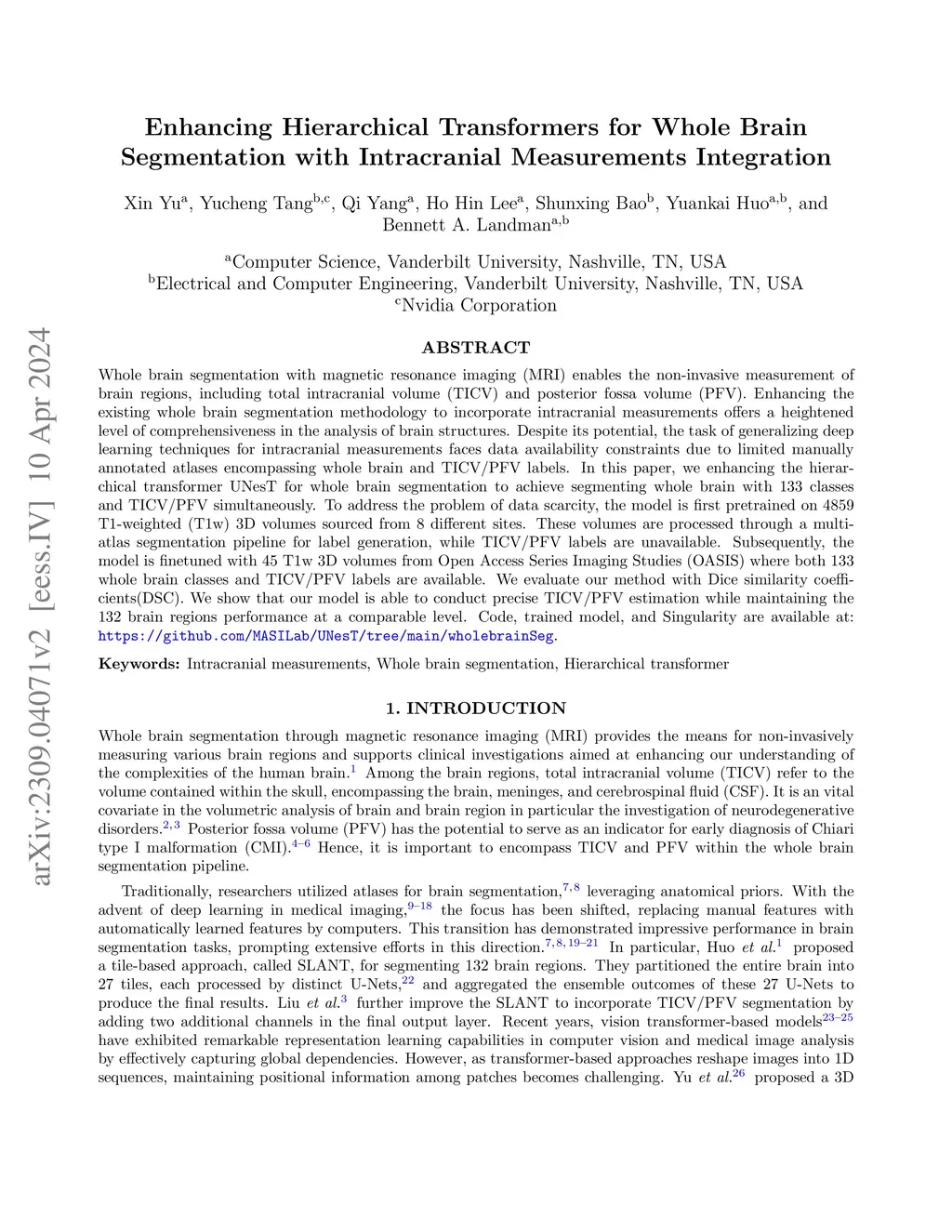 Whole brain segmentation with magnetic resonance imaging (MRI) enables the non-invasive measurement of brain regions, including total intracranial volume (TICV) and posterior fossa volume (PFV). Enhancing the existing whole brain segmentation methodology to incorporate intracranial measurements offers a heightened level of comprehensiveness in the analysis of brain structures. Despite its potential, the task of generalizing deep learning techniques for intracranial measurements faces data availability constraints due to limited manually annotated atlases encompassing whole brain and TICV/PFV labels. In this paper, we enhancing the hierarchical transformer UNesT for whole brain segmentation to achieve segmenting whole brain with 133 classes and TICV/PFV simultaneously. To address the problem of data scarcity, the model is first pretrained on 4859 T1-weighted (T1w) 3D volumes sourced from 8 different sites. These volumes are processed through a multi-atlas segmentation pipeline for label generation, while TICV/PFV labels are unavailable. Subsequently, the model is finetuned with 45 T1w 3D volumes from Open Access Series Imaging Studies (OASIS) where both 133 whole brain classes and TICV/PFV labels are available. We evaluate our method with Dice similarity coefficients(DSC). We show that our model is able to conduct precise TICV/PFV estimation while maintaining the 132 brain regions performance at a comparable level. Code and trained model are available at: https://github.com/MASILab/UNesT/tree/main/wholebrainSeg.
