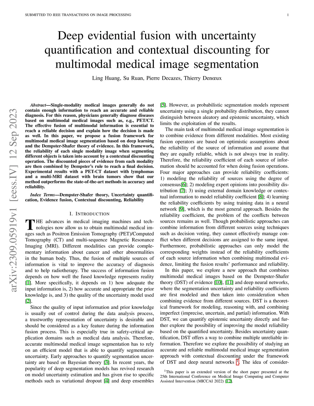 Single-modality medical images generally do not contain enough information to reach an accurate and reliable diagnosis. For this reason, physicians generally diagnose diseases based on multimodal medical images such as, e.g., PET/CT. The effective fusion of multimodal information is essential to reach a reliable decision and explain how the decision is made as well. In this paper, we propose a fusion framework for multimodal medical image segmentation based on deep learning and the Dempster-Shafer theory of evidence. In this framework, the reliability of each single modality image when segmenting different objects is taken into account by a contextual discounting operation. The discounted pieces of evidence from each modality are then combined by Dempster's rule to reach a final decision. Experimental results with a PET-CT dataset with lymphomas and a multi-MRI dataset with brain tumors show that our method outperforms the state-of-the-art methods in accuracy and reliability.
