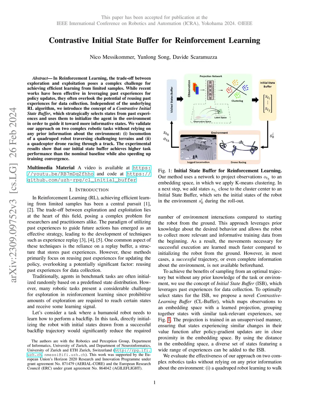 In Reinforcement Learning, the trade-off between exploration and exploitation poses a complex challenge for achieving efficient learning from limited samples. While recent works have been effective in leveraging past experiences for policy updates, they often overlook the potential of reusing past experiences for data collection. Independent of the underlying RL algorithm, we introduce the concept of a Contrastive Initial State Buffer, which strategically selects states from past experiences and uses them to initialize the agent in the environment in order to guide it toward more informative states. We validate our approach on two complex robotic tasks without relying on any prior information about the environment: (i) locomotion of a quadruped robot traversing challenging terrains and (ii) a quadcopter drone racing through a track. The experimental results show that our initial state buffer achieves higher task performance than the nominal baseline while also speeding up training convergence.