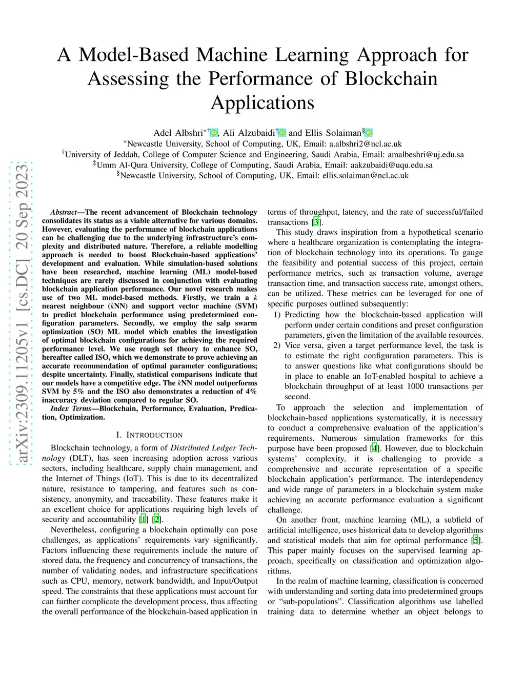 The recent advancement of Blockchain technology consolidates its status as a viable alternative for various domains. However, evaluating the performance of blockchain applications can be challenging due to the underlying infrastructure's complexity and distributed nature. Therefore, a reliable modelling approach is needed to boost Blockchain-based applications' development and evaluation. While simulation-based solutions have been researched, machine learning (ML) model-based techniques are rarely discussed in conjunction with evaluating blockchain application performance. Our novel research makes use of two ML model-based methods. Firstly, we train a nearest neighbour (NN) and support vector machine (SVM) to predict blockchain performance using predetermined configuration parameters. Secondly, we employ the salp swarm optimization (SO) ML model which enables the investigation of optimal blockchain configurations for achieving the required performance level. We use rough set theory to enhance SO, hereafter called ISO, which we demonstrate to prove achieving an accurate recommendation of optimal parameter configurations; despite uncertainty. Finally, statistical comparisons indicate that our models have a competitive edge. The NN model outperforms SVM by 5\% and the ISO also demonstrates a reduction of 4\% inaccuracy deviation compared to regular SO.