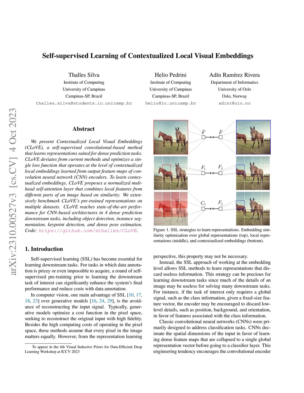 We present Contextualized Local Visual Embeddings (CLoVE), a self-supervised convolutional-based method that learns representations suited for dense prediction tasks. CLoVE deviates from current methods and optimizes a single loss function that operates at the level of contextualized local embeddings learned from output feature maps of convolution neural network (CNN) encoders. To learn contextualized embeddings, CLoVE proposes a normalized mult-head self-attention layer that combines local features from different parts of an image based on similarity. We extensively benchmark CLoVE's pre-trained representations on multiple datasets. CLoVE reaches state-of-the-art performance for CNN-based architectures in 4 dense prediction downstream tasks, including object detection, instance segmentation, keypoint detection, and dense pose estimation.