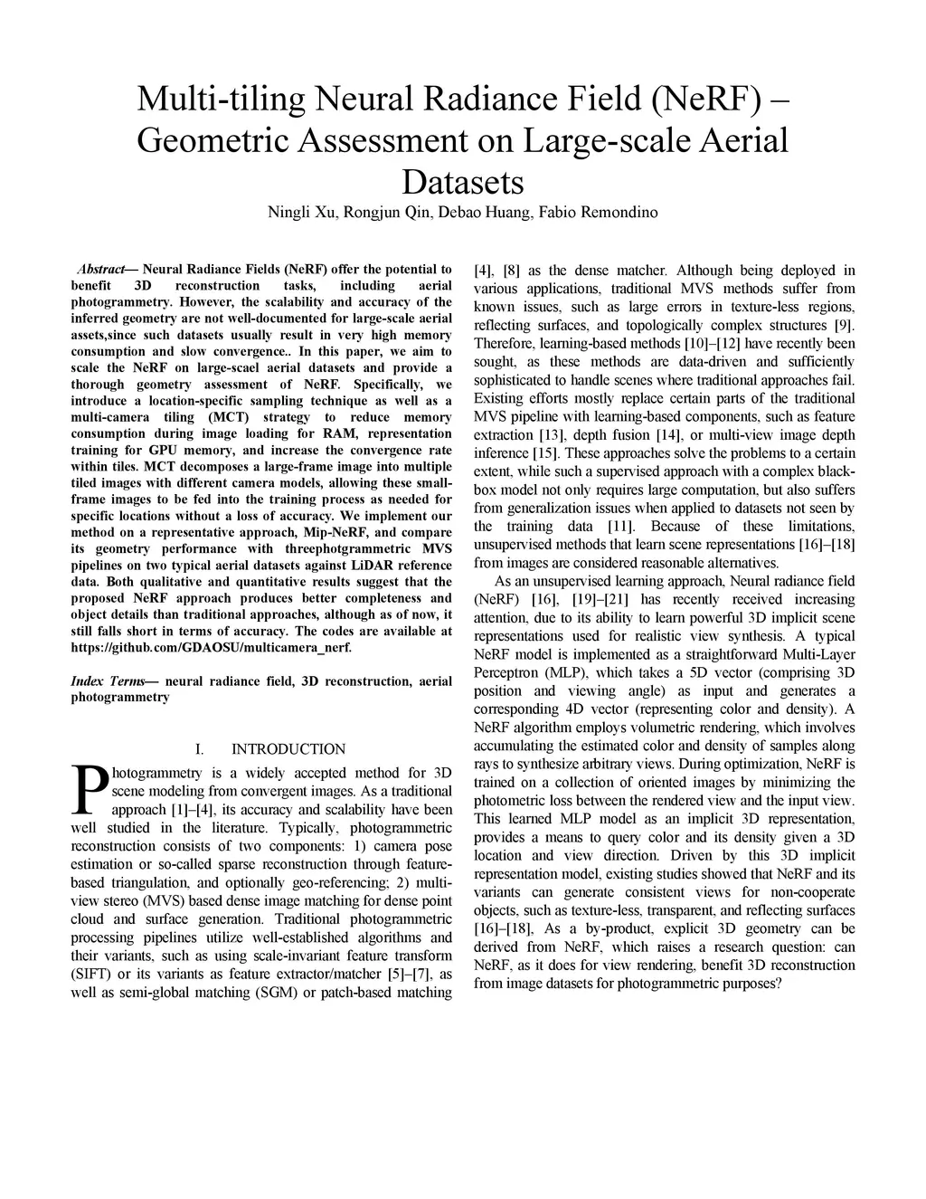 Neural Radiance Fields (NeRF) offer the potential to benefit 3D reconstruction tasks, including aerial photogrammetry. However, the scalability and accuracy of the inferred geometry are not well-documented for large-scale aerial assets,since such datasets usually result in very high memory consumption and slow convergence.. In this paper, we aim to scale the NeRF on large-scael aerial datasets and provide a thorough geometry assessment of NeRF. Specifically, we introduce a location-specific sampling technique as well as a multi-camera tiling (MCT) strategy to reduce memory consumption during image loading for RAM, representation training for GPU memory, and increase the convergence rate within tiles. MCT decomposes a large-frame image into multiple tiled images with different camera models, allowing these small-frame images to be fed into the training process as needed for specific locations without a loss of accuracy. We implement our method on a representative approach, Mip-NeRF, and compare its geometry performance with threephotgrammetric MVS pipelines on two typical aerial datasets against LiDAR reference data. Both qualitative and quantitative results suggest that the proposed NeRF approach produces better completeness and object details than traditional approaches, although as of now, it still falls short in terms of accuracy.