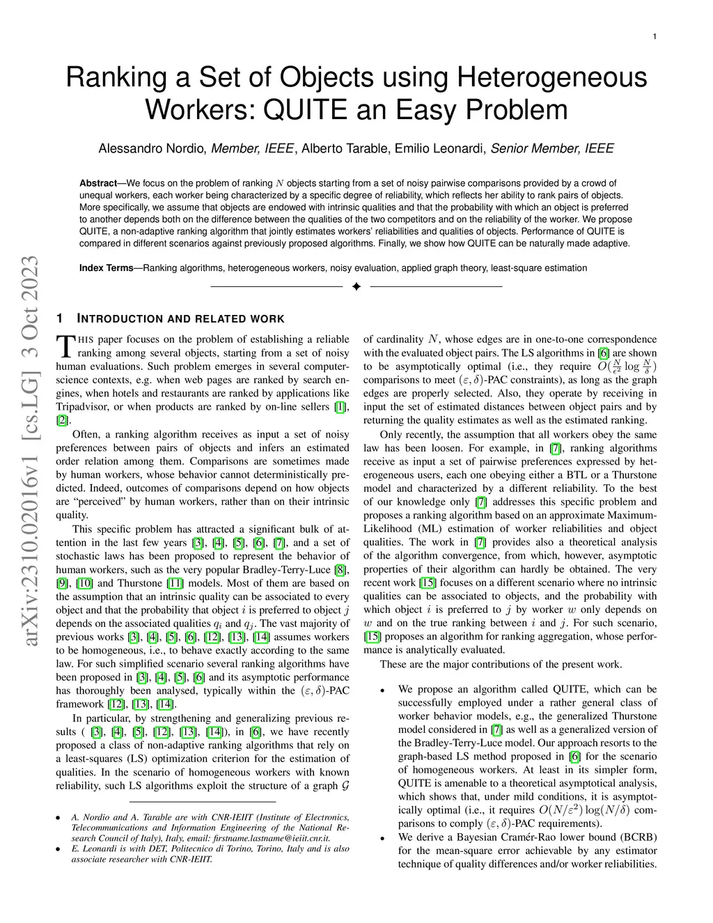 We focus on the problem of ranking objects starting from a set of noisy pairwise comparisons provided by a crowd of unequal workers, each worker being characterized by a specific degree of reliability, which reflects her ability to rank pairs of objects. More specifically, we assume that objects are endowed with intrinsic qualities and that the probability with which an object is preferred to another depends both on the difference between the qualities of the two competitors and on the reliability of the worker. We propose QUITE, a non-adaptive ranking algorithm that jointly estimates workers' reliabilities and qualities of objects. Performance of QUITE is compared in different scenarios against previously proposed algorithms. Finally, we show how QUITE can be naturally made adaptive.