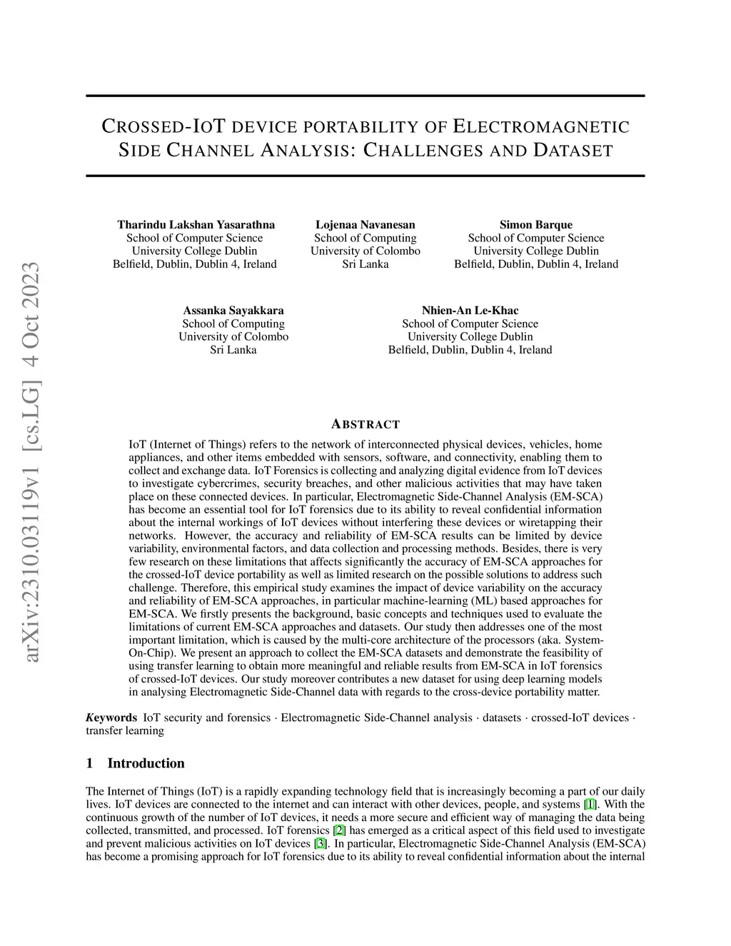IoT (Internet of Things) refers to the network of interconnected physical devices, vehicles, home appliances, and other items embedded with sensors, software, and connectivity, enabling them to collect and exchange data. IoT Forensics is collecting and analyzing digital evidence from IoT devices to investigate cybercrimes, security breaches, and other malicious activities that may have taken place on these connected devices. In particular, EM-SCA has become an essential tool for IoT forensics due to its ability to reveal confidential information about the internal workings of IoT devices without interfering these devices or wiretapping their networks. However, the accuracy and reliability of EM-SCA results can be limited by device variability, environmental factors, and data collection and processing methods. Besides, there is very few research on these limitations that affects significantly the accuracy of EM-SCA approaches for the crossed-IoT device portability as well as limited research on the possible solutions to address such challenge. Therefore, this empirical study examines the impact of device variability on the accuracy and reliability of EM-SCA approaches, in particular machine-learning (ML) based approaches for EM-SCA. We firstly presents the background, basic concepts and techniques used to evaluate the limitations of current EM-SCA approaches and datasets. Our study then addresses one of the most important limitation, which is caused by the multi-core architecture of the processors (SoC). We present an approach to collect the EM-SCA datasets and demonstrate the feasibility of using transfer learning to obtain more meaningful and reliable results from EM-SCA in IoT forensics of crossed-IoT devices. Our study moreover contributes a new dataset for using deep learning models in analysing Electromagnetic Side-Channel data with regards to the cross-device portability matter.