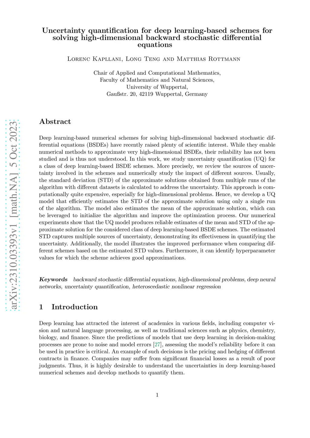 Deep learning-based numerical schemes for solving high-dimensional backward stochastic differential equations (BSDEs) have recently raised plenty of scientific interest. While they enable numerical methods to approximate very high-dimensional BSDEs, their reliability has not been studied and is thus not understood. In this work, we study uncertainty quantification (UQ) for a class of deep learning-based BSDE schemes. More precisely, we review the sources of uncertainty involved in the schemes and numerically study the impact of different sources. Usually, the standard deviation (STD) of the approximate solutions obtained from multiple runs of the algorithm with different datasets is calculated to address the uncertainty. This approach is computationally quite expensive, especially for high-dimensional problems. Hence, we develop a UQ model that efficiently estimates the STD of the approximate solution using only a single run of the algorithm. The model also estimates the mean of the approximate solution, which can be leveraged to initialize the algorithm and improve the optimization process. Our numerical experiments show that the UQ model produces reliable estimates of the mean and STD of the approximate solution for the considered class of deep learning-based BSDE schemes. The estimated STD captures multiple sources of uncertainty, demonstrating its effectiveness in quantifying the uncertainty. Additionally, the model illustrates the improved performance when comparing different schemes based on the estimated STD values. Furthermore, it can identify hyperparameter values for which the scheme achieves good approximations.