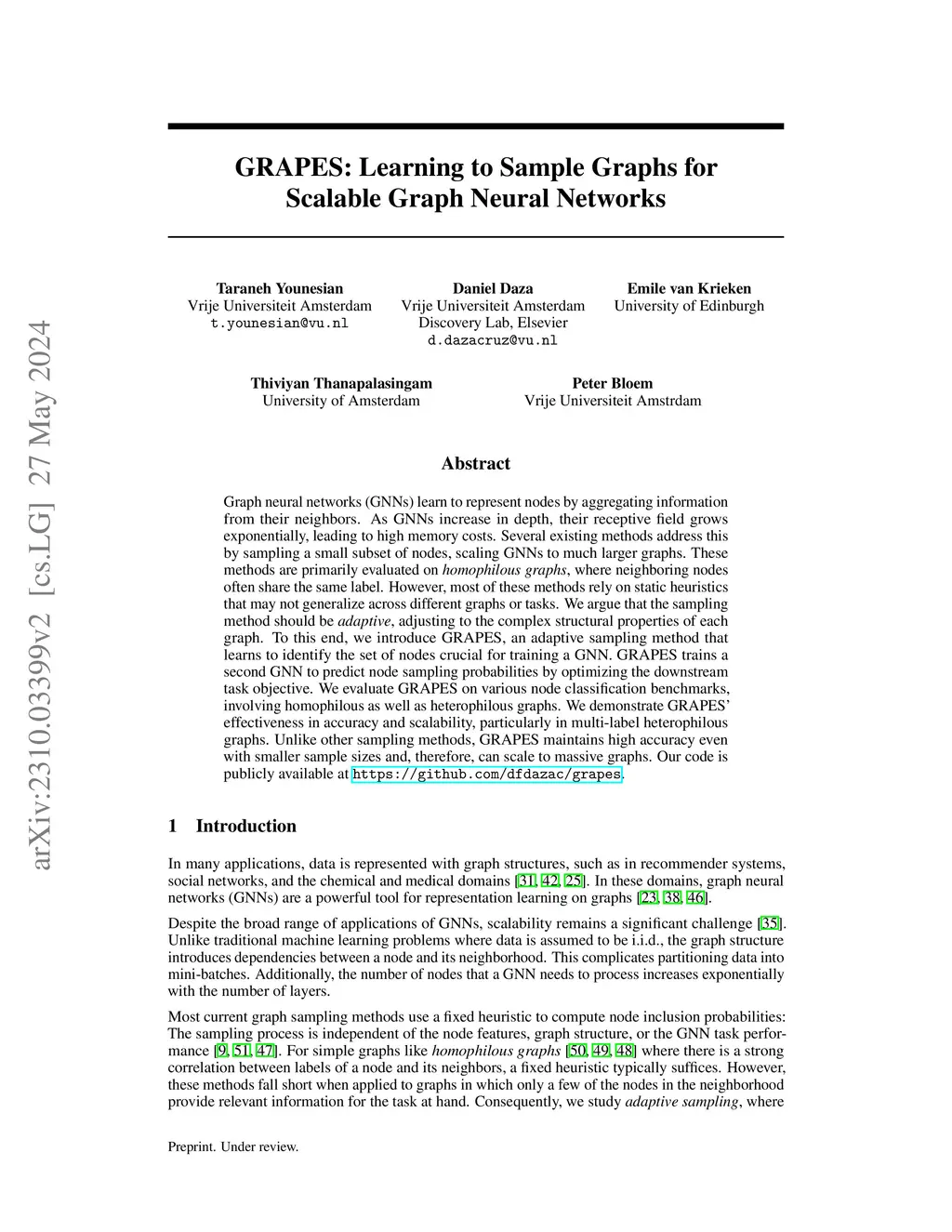 Graph neural networks (GNNs) learn to represent nodes by aggregating information from their neighbors. As GNNs increase in depth, their receptive field grows exponentially, leading to high memory costs. Several existing methods address this by sampling a small subset of nodes, scaling GNNs to much larger graphs. These methods are primarily evaluated on homophilous graphs, where neighboring nodes often share the same label. However, most of these methods rely on static heuristics that may not generalize across different graphs or tasks. We argue that the sampling method should be adaptive, adjusting to the complex structural properties of each graph. To this end, we introduce GRAPES, an adaptive sampling method that learns to identify the set of nodes crucial for training a GNN. GRAPES trains a second GNN to predict node sampling probabilities by optimizing the downstream task objective. We evaluate GRAPES on various node classification benchmarks, involving homophilous as well as heterophilous graphs. We demonstrate GRAPES' effectiveness in accuracy and scalability, particularly in multi-label heterophilous graphs. Unlike other sampling methods, GRAPES maintains high accuracy even with smaller sample sizes and, therefore, can scale to massive graphs. Our code is publicly available atthis https URL.