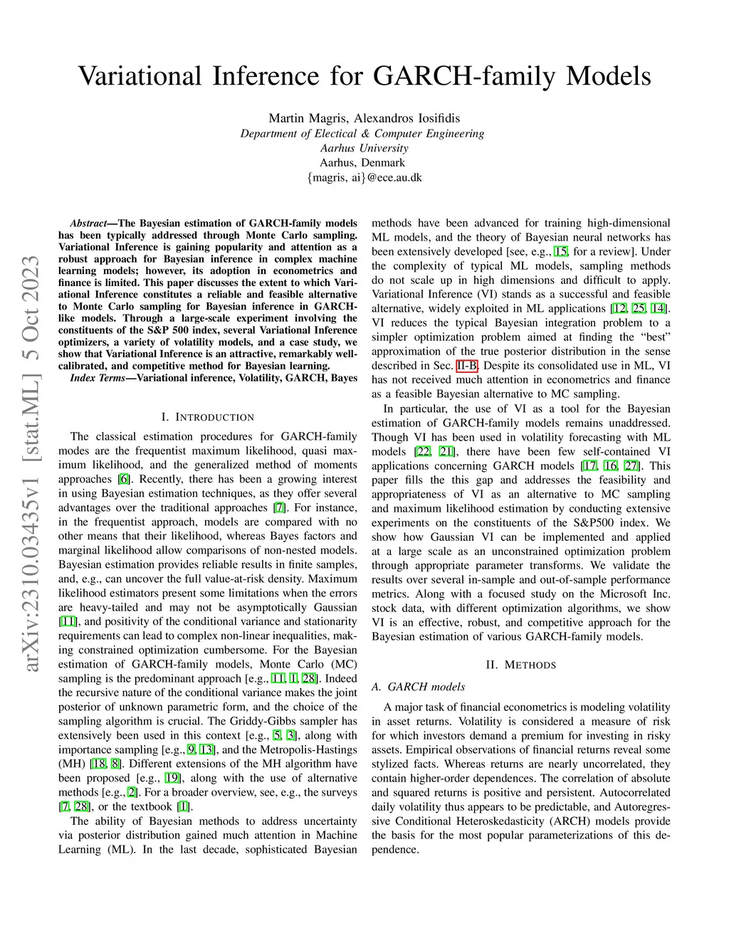 The Bayesian estimation of GARCH-family models has been typically addressed through Monte Carlo sampling. Variational Inference is gaining popularity and attention as a robust approach for Bayesian inference in complex machine learning models; however, its adoption in econometrics and finance is limited. This paper discusses the extent to which Variational Inference constitutes a reliable and feasible alternative to Monte Carlo sampling for Bayesian inference in GARCH-like models. Through a large-scale experiment involving the constituents of the S&P 500 index, several Variational Inference optimizers, a variety of volatility models, and a case study, we show that Variational Inference is an attractive, remarkably well-calibrated, and competitive method for Bayesian learning.