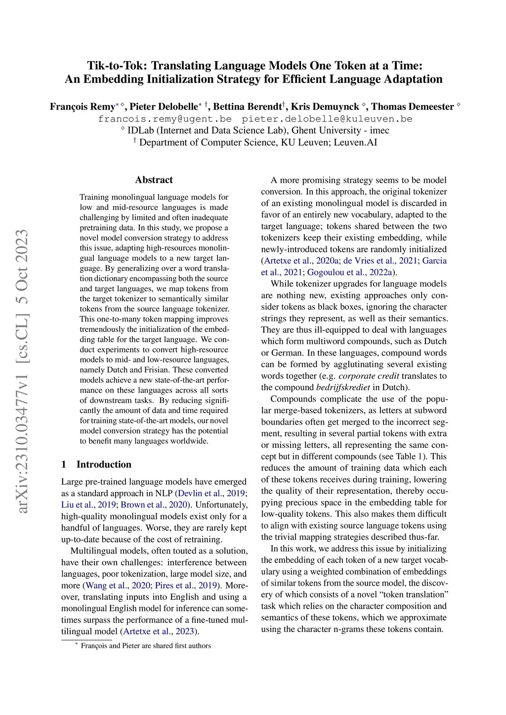 Training monolingual language models for low and mid-resource languages is made challenging by limited and often inadequate pretraining data. In this study, we propose a novel model conversion strategy to address this issue, adapting high-resources monolingual language models to a new target language. By generalizing over a word translation dictionary encompassing both the source and target languages, we map tokens from the target tokenizer to semantically similar tokens from the source language tokenizer. This one-to-many token mapping improves tremendously the initialization of the embedding table for the target language. We conduct experiments to convert high-resource models to mid- and low-resource languages, namely Dutch and Frisian. These converted models achieve a new state-of-the-art performance on these languages across all sorts of downstream tasks. By reducing significantly the amount of data and time required for training state-of-the-art models, our novel model conversion strategy has the potential to benefit many languages worldwide.