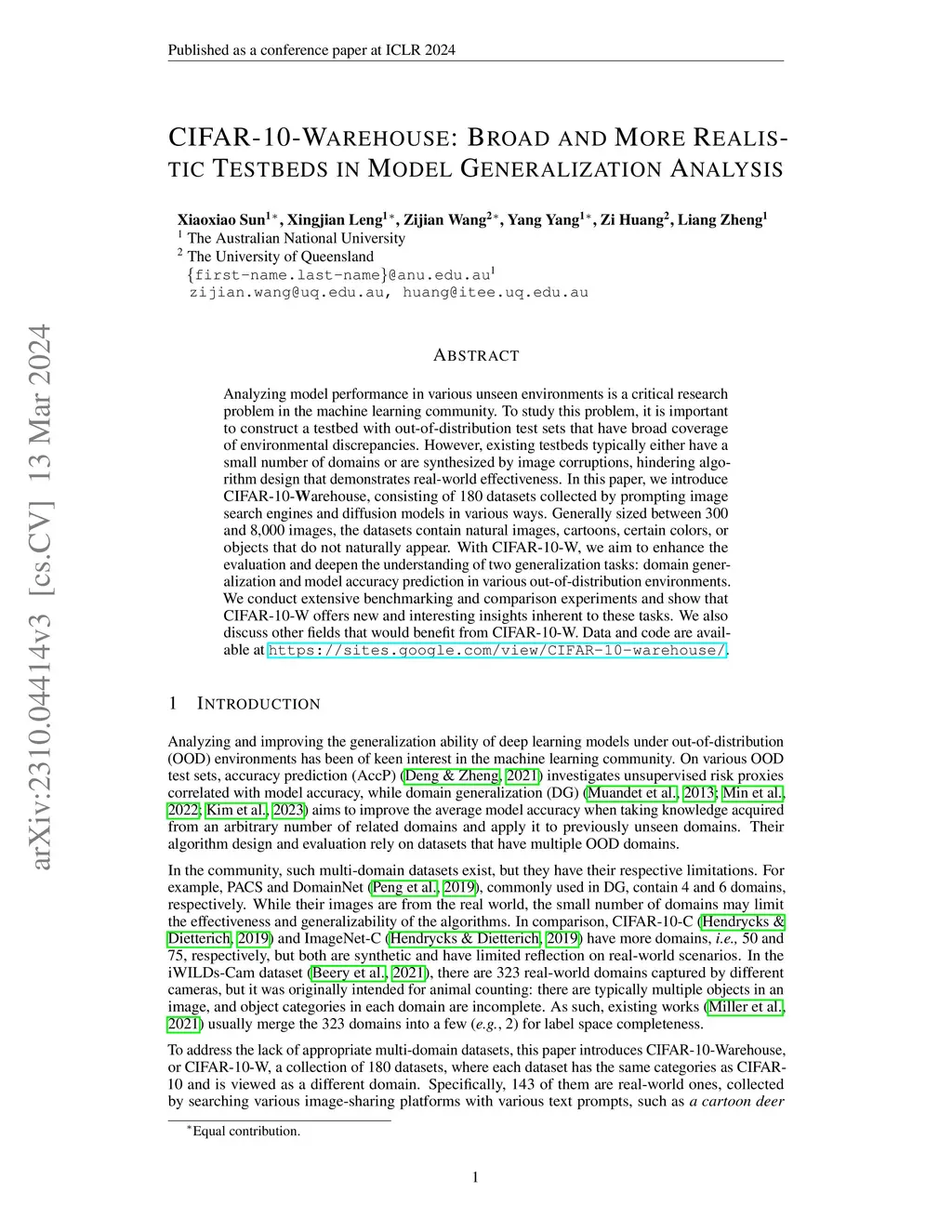Analyzing model performance in various unseen environments is a critical research problem in the machine learning community. To study this problem, it is important to construct a testbed with out-of-distribution test sets that have broad coverage of environmental discrepancies. However, existing testbeds typically either have a small number of domains or are synthesized by image corruptions, hindering algorithm design that demonstrates real-world effectiveness. In this paper, we introduce CIFAR-10-Warehouse, consisting of 180 datasets collected by prompting image search engines and diffusion models in various ways. Generally sized between 300 and 8,000 images, the datasets contain natural images, cartoons, certain colors, or objects that do not naturally appear. With CIFAR-10-W, we aim to enhance the evaluation and deepen the understanding of two generalization tasks: domain generalization and model accuracy prediction in various out-of-distribution environments. We conduct extensive benchmarking and comparison experiments and show that CIFAR-10-W offers new and interesting insights inherent to these tasks. We also discuss other fields that would benefit from CIFAR-10-W.