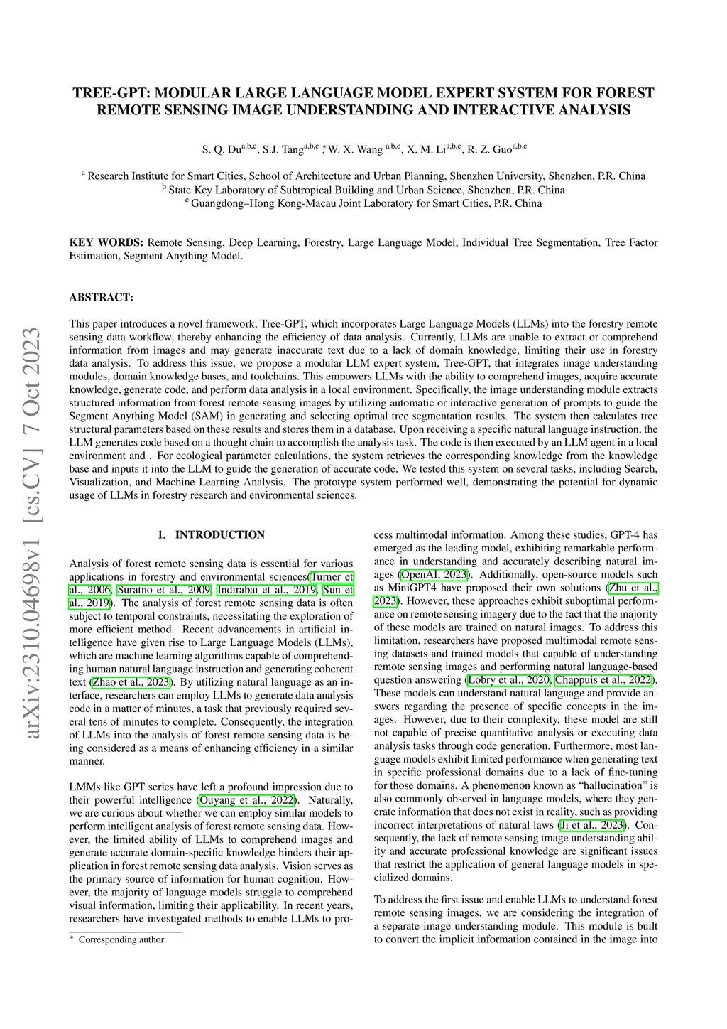 This paper introduces a novel framework, Tree-GPT, which incorporates Large Language Models (LLMs) into the forestry remote sensing data workflow, thereby enhancing the efficiency of data analysis. Currently, LLMs are unable to extract or comprehend information from images and may generate inaccurate text due to a lack of domain knowledge, limiting their use in forestry data analysis. To address this issue, we propose a modular LLM expert system, Tree-GPT, that integrates image understanding modules, domain knowledge bases, and toolchains. This empowers LLMs with the ability to comprehend images, acquire accurate knowledge, generate code, and perform data analysis in a local environment. Specifically, the image understanding module extracts structured information from forest remote sensing images by utilizing automatic or interactive generation of prompts to guide the Segment Anything Model (SAM) in generating and selecting optimal tree segmentation results. The system then calculates tree structural parameters based on these results and stores them in a database. Upon receiving a specific natural language instruction, the LLM generates code based on a thought chain to accomplish the analysis task. The code is then executed by an LLM agent in a local environment and . For ecological parameter calculations, the system retrieves the corresponding knowledge from the knowledge base and inputs it into the LLM to guide the generation of accurate code. We tested this system on several tasks, including Search, Visualization, and Machine Learning Analysis. The prototype system performed well, demonstrating the potential for dynamic usage of LLMs in forestry research and environmental sciences.