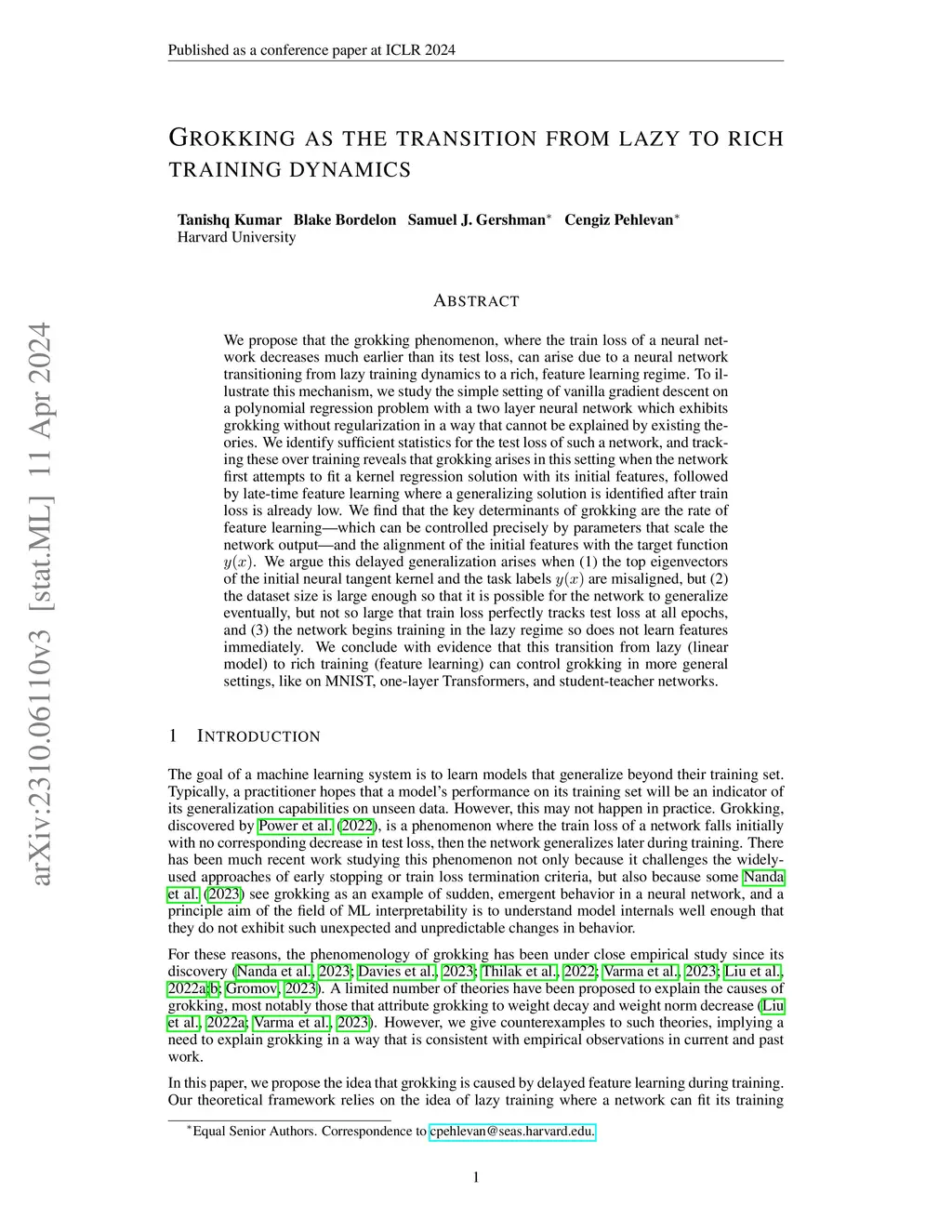 We propose that the grokking phenomenon, where the train loss of a neural network decreases much earlier than its test loss, can arise due to a neural network transitioning from lazy training dynamics to a rich, feature learning regime. To illustrate this mechanism, we study the simple setting of vanilla gradient descent on a polynomial regression problem with a two layer neural network which exhibits grokking without regularization in a way that cannot be explained by existing theories. We identify sufficient statistics for the test loss of such a network, and tracking these over training reveals that grokking arises in this setting when the network first attempts to fit a kernel regression solution with its initial features, followed by late-time feature learning where a generalizing solution is identified after train loss is already low. We find that the key determinants of grokking are the rate of feature learning -- which can be controlled precisely by parameters that scale the network output -- and the alignment of the initial features with the target function . We argue this delayed generalization arises when (1) the top eigenvectors of the initial neural tangent kernel and the task labels are misaligned, but (2) the dataset size is large enough so that it is possible for the network to generalize eventually, but not so large that train loss perfectly tracks test loss at all epochs, and (3) the network begins training in the lazy regime so does not learn features immediately. We conclude with evidence that this transition from lazy (linear model) to rich training (feature learning) can control grokking in more general settings, like on MNIST, one-layer Transformers, and student-teacher networks.