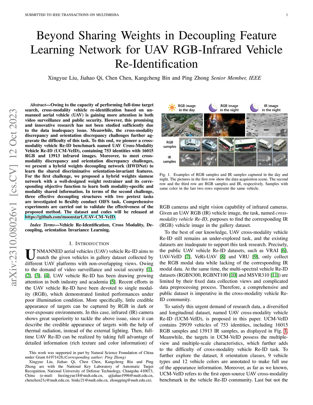 Owing to the capacity of performing full-time target search, cross-modality vehicle re-identification (Re-ID) based on unmanned aerial vehicle (UAV) is gaining more attention in both video surveillance and public security. However, this promising and innovative research has not been studied sufficiently due to the data inadequacy issue. Meanwhile, the cross-modality discrepancy and orientation discrepancy challenges further aggravate the difficulty of this task. To this end, we pioneer a cross-modality vehicle Re-ID benchmark named UAV Cross-Modality Vehicle Re-ID (UCM-VeID), containing 753 identities with 16015 RGB and 13913 infrared images. Moreover, to meet cross-modality discrepancy and orientation discrepancy challenges, we present a hybrid weights decoupling network (HWDNet) to learn the shared discriminative orientation-invariant features. For the first challenge, we proposed a hybrid weights siamese network with a well-designed weight restrainer and its corresponding objective function to learn both modality-specific and modality shared information. In terms of the second challenge, three effective decoupling structures with two pretext tasks are investigated to learn orientation-invariant feature. Comprehensive experiments are carried out to validate the effectiveness of the proposed method. The dataset and codes will be released at https://github.com/moonstarL/UAV-CM-VeID.