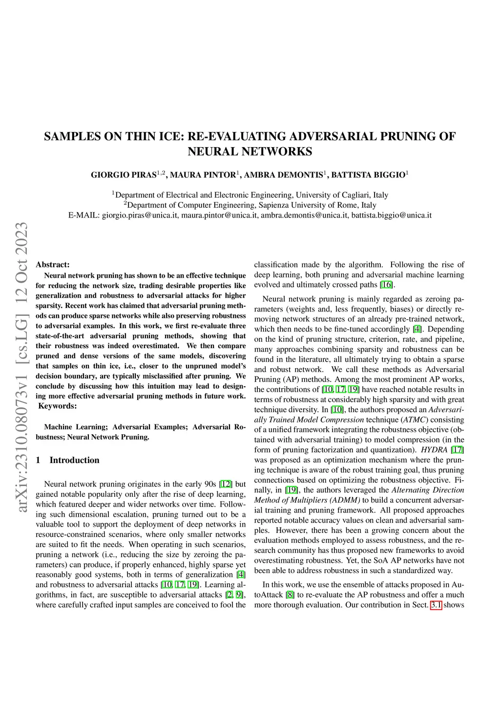 Neural network pruning has shown to be an effective technique for reducing the network size, trading desirable properties like generalization and robustness to adversarial attacks for higher sparsity. Recent work has claimed that adversarial pruning methods can produce sparse networks while also preserving robustness to adversarial examples. In this work, we first re-evaluate three state-of-the-art adversarial pruning methods, showing that their robustness was indeed overestimated. We then compare pruned and dense versions of the same models, discovering that samples on thin ice, i.e., closer to the unpruned model's decision boundary, are typically misclassified after pruning. We conclude by discussing how this intuition may lead to designing more effective adversarial pruning methods in future work.