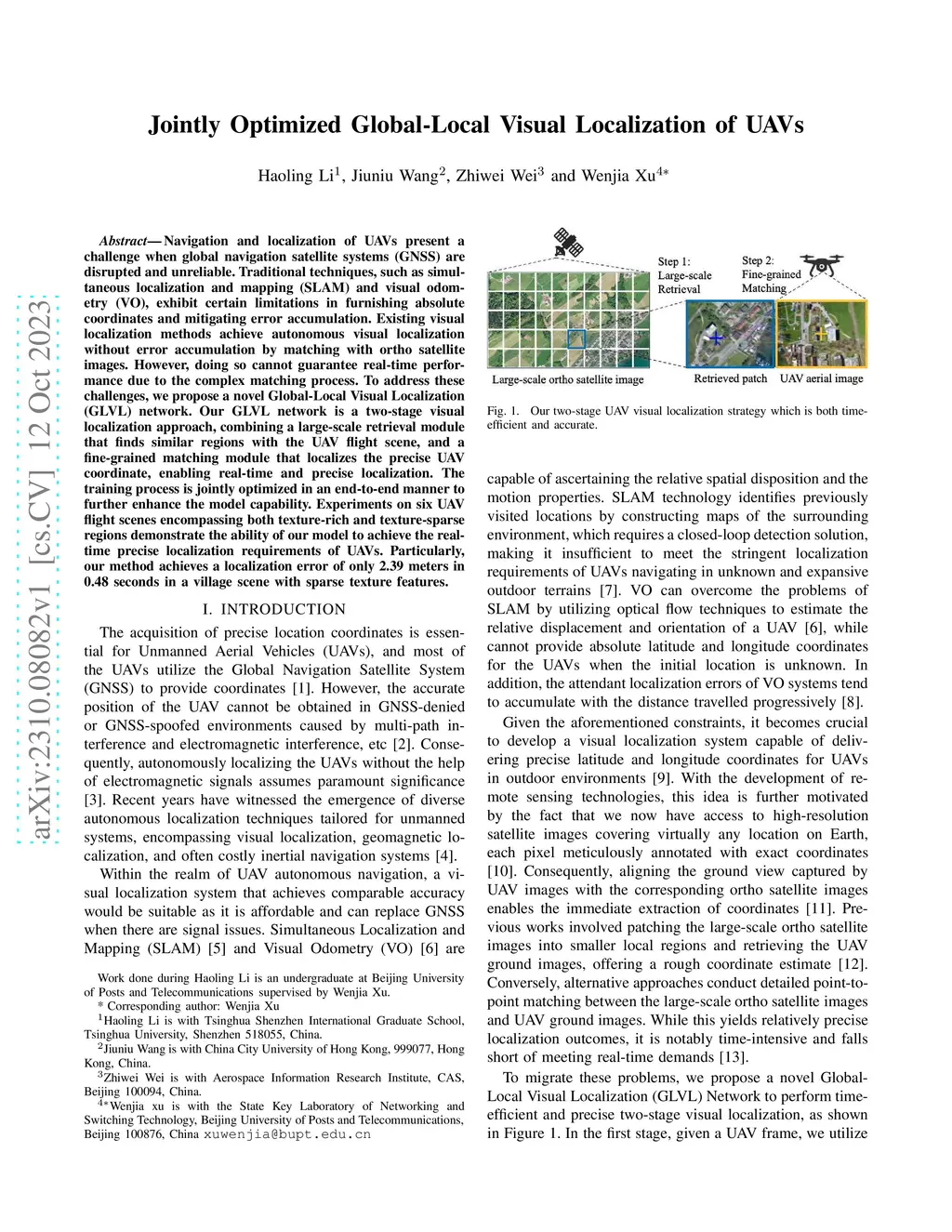 Navigation and localization of UAVs present a challenge when global navigation satellite systems (GNSS) are disrupted and unreliable. Traditional techniques, such as simultaneous localization and mapping (SLAM) and visual odometry (VO), exhibit certain limitations in furnishing absolute coordinates and mitigating error accumulation. Existing visual localization methods achieve autonomous visual localization without error accumulation by matching with ortho satellite images. However, doing so cannot guarantee real-time performance due to the complex matching process. To address these challenges, we propose a novel Global-Local Visual Localization (GLVL) network. Our GLVL network is a two-stage visual localization approach, combining a large-scale retrieval module that finds similar regions with the UAV flight scene, and a fine-grained matching module that localizes the precise UAV coordinate, enabling real-time and precise localization. The training process is jointly optimized in an end-to-end manner to further enhance the model capability. Experiments on six UAV flight scenes encompassing both texture-rich and texture-sparse regions demonstrate the ability of our model to achieve the real-time precise localization requirements of UAVs. Particularly, our method achieves a localization error of only 2.39 meters in 0.48 seconds in a village scene with sparse texture features.