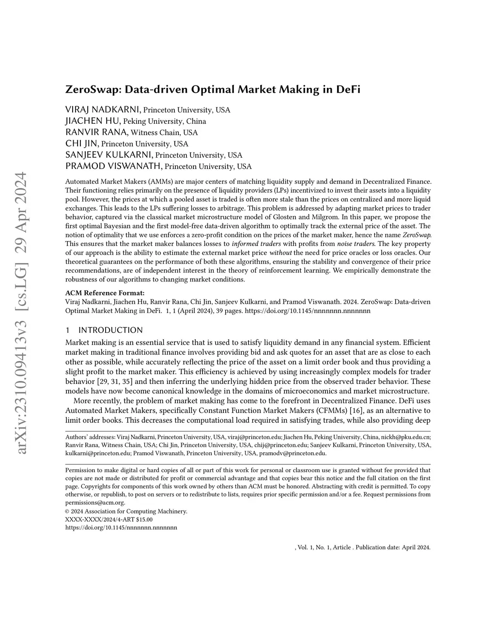 Automated Market Makers (AMMs) are major centers of matching liquidity supply and demand in Decentralized Finance. Their functioning relies primarily on the presence of liquidity providers (LPs) incentivized to invest their assets into a liquidity pool. However, the prices at which a pooled asset is traded is often more stale than the prices on centralized and more liquid exchanges. This leads to the LPs suffering losses to arbitrage. This problem is addressed by adapting market prices to trader behavior, captured via the classical market microstructure model of Glosten and Milgrom. In this paper, we propose the first optimal Bayesian and the first model-free data-driven algorithm to optimally track the external price of the asset. The notion of optimality that we use enforces a zero-profit condition on the prices of the market maker, hence the name ZeroSwap. This ensures that the market maker balances losses to informed traders with profits from noise traders. The key property of our approach is the ability to estimate the external market price without the need for price oracles or loss oracles. Our theoretical guarantees on the performance of both these algorithms, ensuring the stability and convergence of their price recommendations, are of independent interest in the theory of reinforcement learning. We empirically demonstrate the robustness of our algorithms to changing market conditions.