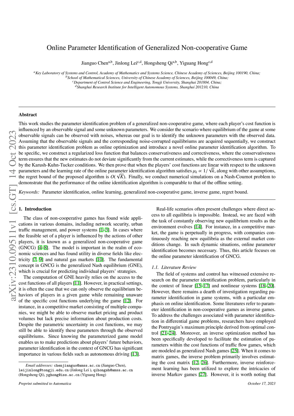 This work studies the parameter identification problem of a generalized non-cooperative game, where each player's cost function is influenced by an observable signal and some unknown parameters. We consider the scenario where equilibrium of the game at some observable signals can be observed with noises, whereas our goal is to identify the unknown parameters with the observed data. Assuming that the observable signals and the corresponding noise-corrupted equilibriums are acquired sequentially, we construct this parameter identification problem as online optimization and introduce a novel online parameter identification algorithm. To be specific, we construct a regularized loss function that balances conservativeness and correctiveness, where the conservativeness term ensures that the new estimates do not deviate significantly from the current estimates, while the correctiveness term is captured by the Karush-Kuhn-Tucker conditions. We then prove that when the players' cost functions are linear with respect to the unknown parameters and the learning rate of the online parameter identification algorithm satisfies \mu_k \propto 1/\sqrt{k}, along with other assumptions, the regret bound of the proposed algorithm is O(\sqrt{K}). Finally, we conduct numerical simulations on a Nash-Cournot problem to demonstrate that the performance of the online identification algorithm is comparable to that of the offline setting.