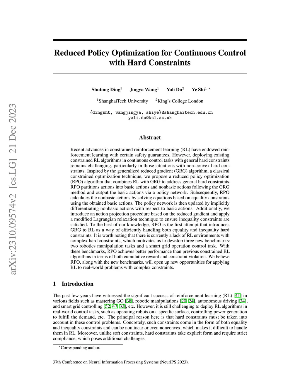 Reduced Policy Optimization for Continuous Control with Hard Constraints