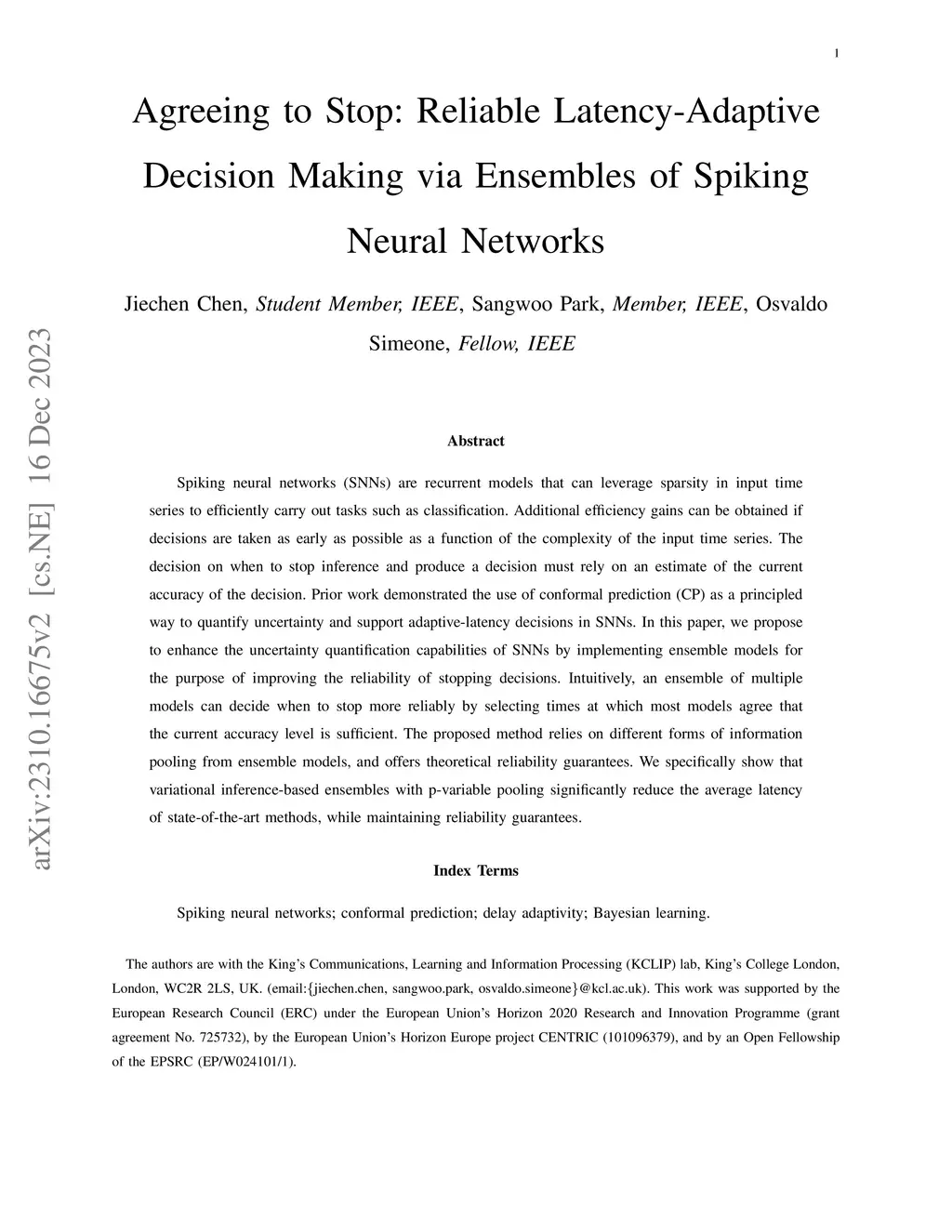 Spiking neural networks (SNNs) are recurrent models that can leverage sparsity in input time series to efficiently carry out tasks such as classification. Additional efficiency gains can be obtained if decisions are taken as early as possible as a function of the complexity of the input time series. The decision on when to stop inference and produce a decision must rely on an estimate of the current accuracy of the decision. Prior work demonstrated the use of conformal prediction (CP) as a principled way to quantify uncertainty and support adaptive-latency decisions in SNNs. In this paper, we propose to enhance the uncertainty quantification capabilities of SNNs by implementing ensemble models for the purpose of improving the reliability of stopping decisions. Intuitively, an ensemble of multiple models can decide when to stop more reliably by selecting times at which most models agree that the current accuracy level is sufficient. The proposed method relies on different forms of information pooling from ensemble models, and offers theoretical reliability guarantees. We specifically show that variational inference-based ensembles with p-variable pooling significantly reduce the average latency of state-of-the-art methods, while maintaining reliability guarantees.