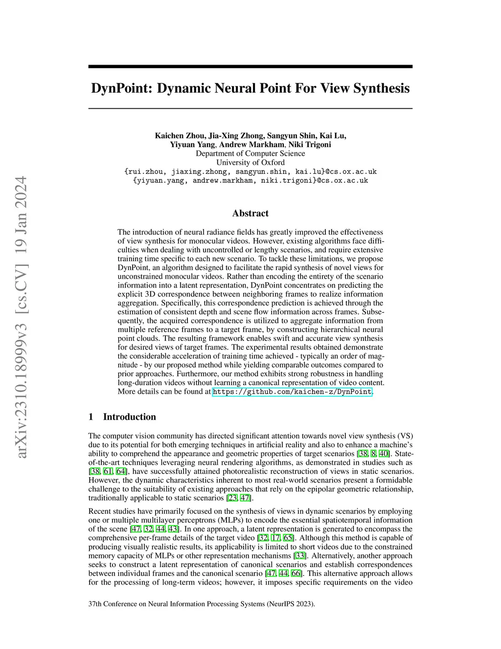 The introduction of neural radiance fields has greatly improved the effectiveness of view synthesis for monocular videos. However, existing algorithms face difficulties when dealing with uncontrolled or lengthy scenarios, and require extensive training time specific to each new scenario. To tackle these limitations, we propose DynPoint, an algorithm designed to facilitate the rapid synthesis of novel views for unconstrained monocular videos. Rather than encoding the entirety of the scenario information into a latent representation, DynPoint concentrates on predicting the explicit 3D correspondence between neighboring frames to realize information aggregation. Specifically, this correspondence prediction is achieved through the estimation of consistent depth and scene flow information across frames. Subsequently, the acquired correspondence is utilized to aggregate information from multiple reference frames to a target frame, by constructing hierarchical neural point clouds. The resulting framework enables swift and accurate view synthesis for desired views of target frames. The experimental results obtained demonstrate the considerable acceleration of training time achieved - typically an order of magnitude - by our proposed method while yielding comparable outcomes compared to prior approaches. Furthermore, our method exhibits strong robustness in handling long-duration videos without learning a canonical representation of video content.