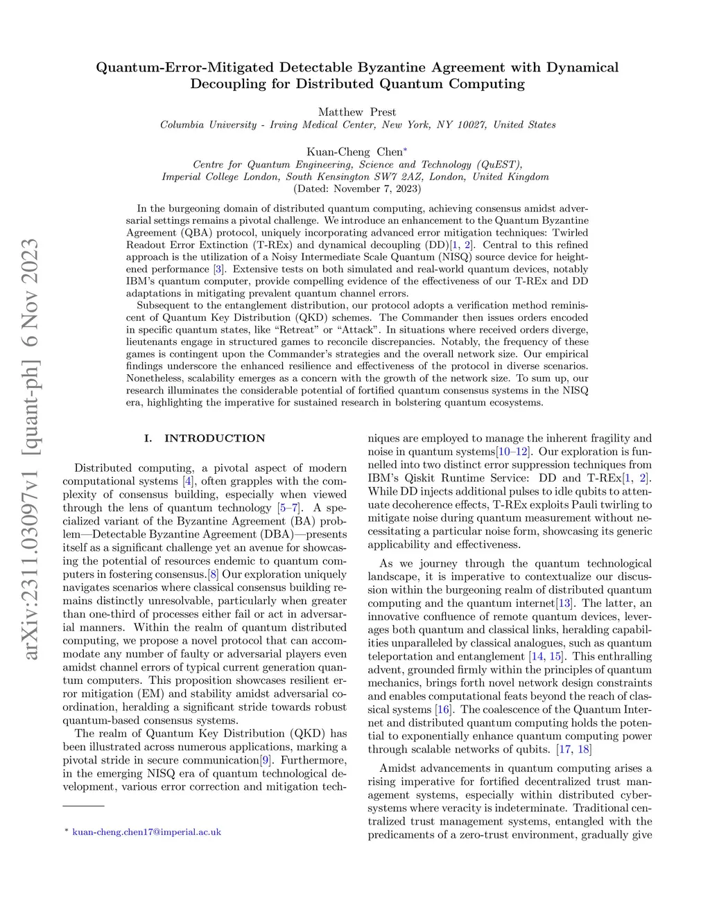 In the burgeoning domain of distributed quantum computing, achieving consensus amidst adversarial settings remains a pivotal challenge. We introduce an enhancement to the Quantum Byzantine Agreement (QBA) protocol, uniquely incorporating advanced error mitigation techniques: Twirled Readout Error Extinction (T-REx) and dynamical decoupling (DD). Central to this refined approach is the utilization of a Noisy Intermediate Scale Quantum (NISQ) source device for heightened performance. Extensive tests on both simulated and real-world quantum devices, notably IBM's quantum computer, provide compelling evidence of the effectiveness of our T-REx and DD adaptations in mitigating prevalent quantum channel errors. Subsequent to the entanglement distribution, our protocol adopts a verification method reminiscent of Quantum Key Distribution (QKD) schemes. The Commander then issues orders encoded in specific quantum states, like Retreat or Attack. In situations where received orders diverge, lieutenants engage in structured games to reconcile discrepancies. Notably, the frequency of these games is contingent upon the Commander's strategies and the overall network size. Our empirical findings underscore the enhanced resilience and effectiveness of the protocol in diverse scenarios. Nonetheless, scalability emerges as a concern with the growth of the network size. To sum up, our research illuminates the considerable potential of fortified quantum consensus systems in the NISQ era, highlighting the imperative for sustained research in bolstering quantum ecosystems.
