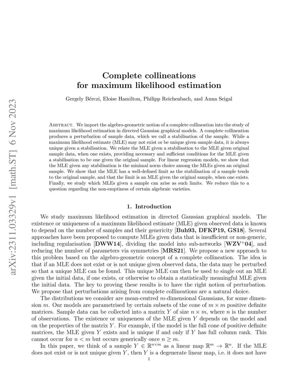 We import the algebro-geometric notion of a complete collineation into the study of maximum likelihood estimation in directed Gaussian graphical models. A complete collineation produces a perturbation of sample data, which we call a stabilisation of the sample. While a maximum likelihood estimate (MLE) may not exist or be unique given sample data, it is always unique given a stabilisation. We relate the MLE given a stabilisation to the MLE given original sample data, when one exists, providing necessary and sufficient conditions for the MLE given a stabilisation to be one given the original sample. For linear regression models, we show that the MLE given any stabilisation is the minimal norm choice among the MLEs given an original sample. We show that the MLE has a well-defined limit as the stabilisation of a sample tends to the original sample, and that the limit is an MLE given the original sample, when one exists. Finally, we study which MLEs given a sample can arise as such limits. We reduce this to a question regarding the non-emptiness of certain algebraic varieties.