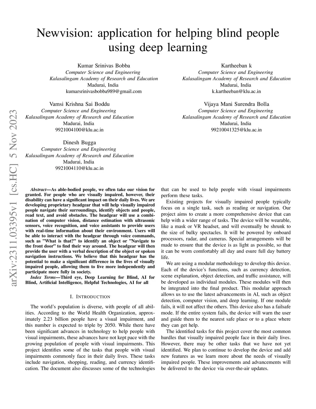 As able-bodied people, we often take our vision for granted. For people who are visually impaired, however, their disability can have a significant impact on their daily lives. We are developing proprietary headgear that will help visually impaired people navigate their surroundings, identify objects and people, read text, and avoid obstacles. The headgear will use a combination of computer vision, distance estimation with ultrasonic sensors, voice recognition, and voice assistants to provide users with real-time information about their environment. Users will be able to interact with the headgear through voice commands, such as ''What is that?'' to identify an object or 'Ñavigate to the front door'' to find their way around. The headgear will then provide the user with a verbal description of the object or spoken navigation instructions. We believe that this headgear has the potential to make a significant difference in the lives of visually impaired people, allowing them to live more independently and participate more fully in society.
