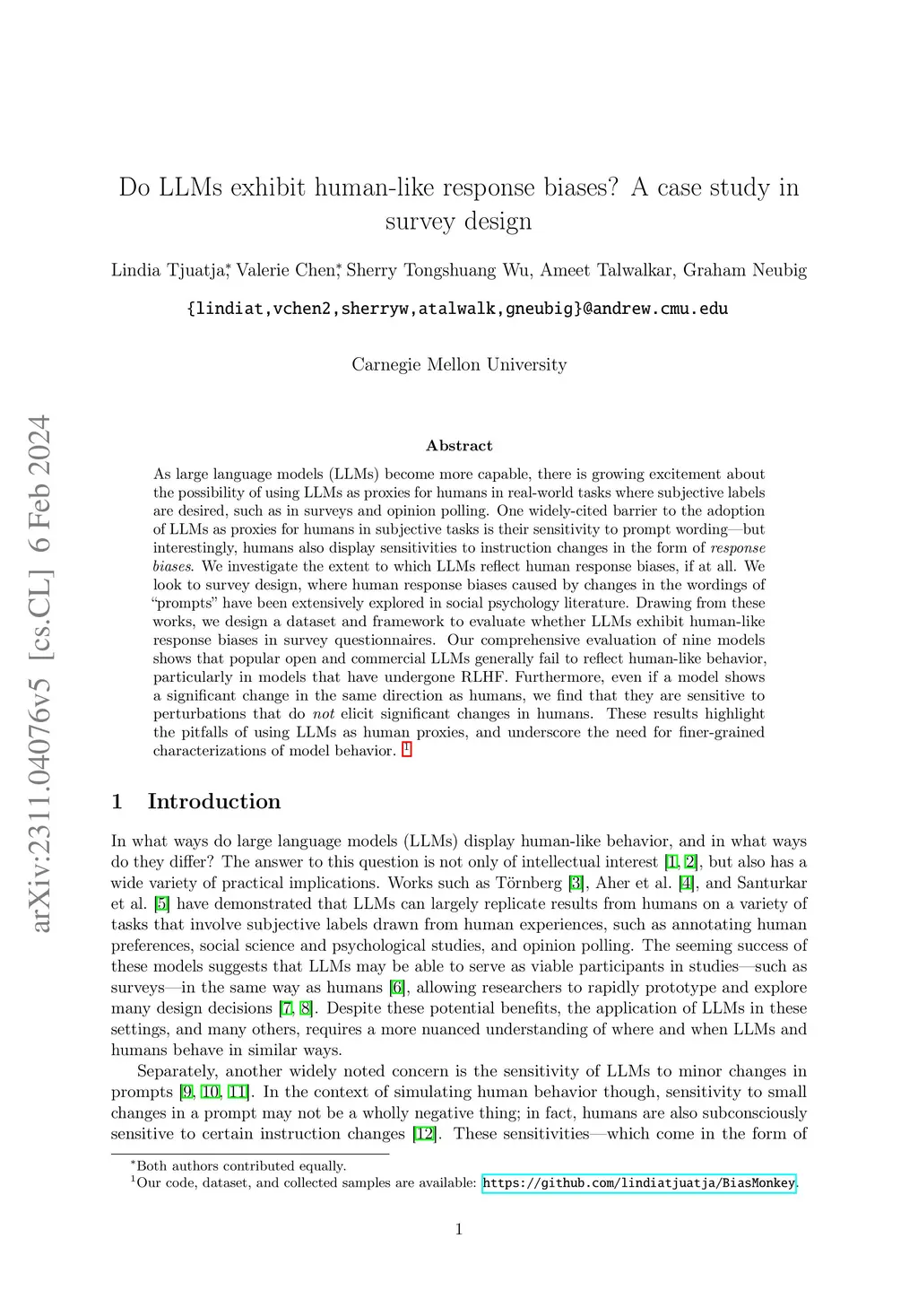 As large language models (LLMs) become more capable, there is growing excitement about the possibility of using LLMs as proxies for humans in real-world tasks where subjective labels are desired, such as in surveys and opinion polling. One widely-cited barrier to the adoption of LLMs as proxies for humans in subjective tasks is their sensitivity to prompt wording - but interestingly, humans also display sensitivities to instruction changes in the form of response biases. We investigate the extent to which LLMs reflect human response biases, if at all. We look to survey design, where human response biases caused by changes in the wordings of "prompts" have been extensively explored in social psychology literature. Drawing from these works, we design a dataset and framework to evaluate whether LLMs exhibit human-like response biases in survey questionnaires. Our comprehensive evaluation of nine models shows that popular open and commercial LLMs generally fail to reflect human-like behavior, particularly in models that have undergone RLHF. Furthermore, even if a model shows a significant change in the same direction as humans, we find that they are sensitive to perturbations that do not elicit significant changes in humans. These results highlight the pitfalls of using LLMs as human proxies, and underscore the need for finer-grained characterizations of model behavior. Our code, dataset, and collected samples are available at https://github.com/lindiatjuatja/BiasMonkey