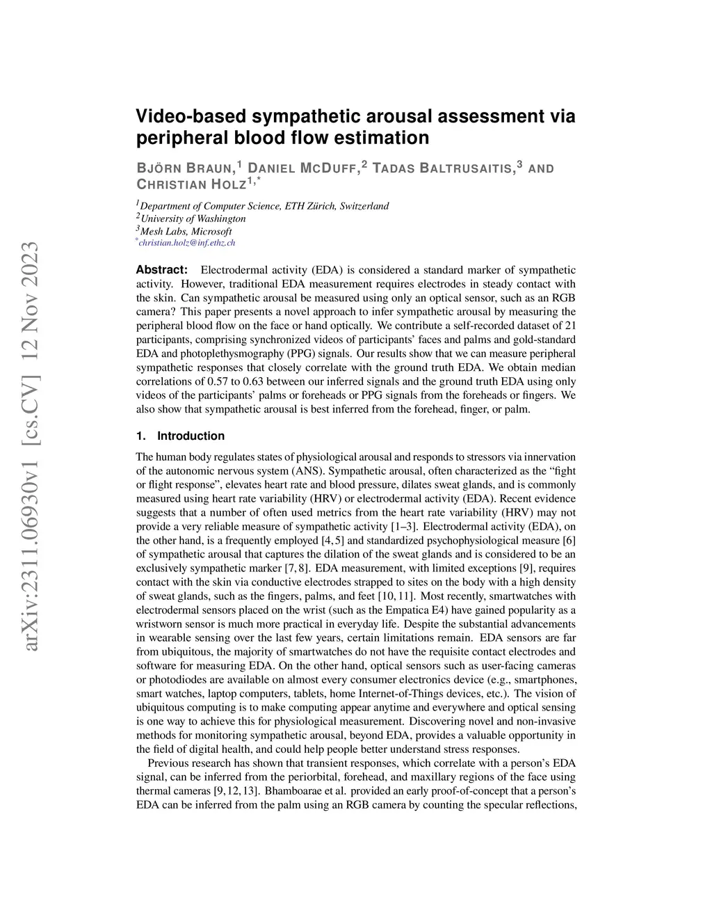 Video-based sympathetic arousal assessment via peripheral blood flow