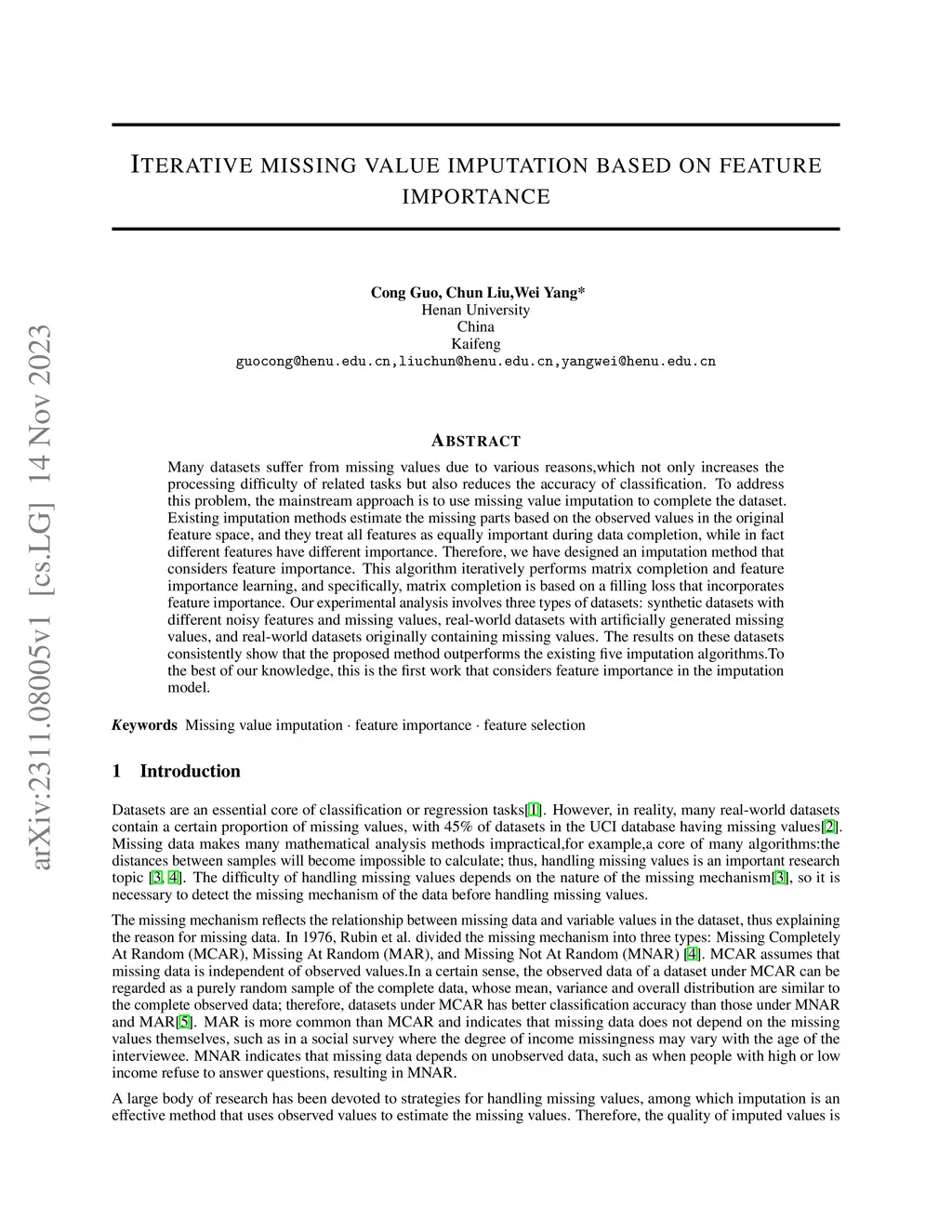 Many datasets suffer from missing values due to various reasons,which not only increases the processing difficulty of related tasks but also reduces the accuracy of classification. To address this problem, the mainstream approach is to use missing value imputation to complete the dataset. Existing imputation methods estimate the missing parts based on the observed values in the original feature space, and they treat all features as equally important during data completion, while in fact different features have different importance. Therefore, we have designed an imputation method that considers feature importance. This algorithm iteratively performs matrix completion and feature importance learning, and specifically, matrix completion is based on a filling loss that incorporates feature importance. Our experimental analysis involves three types of datasets: synthetic datasets with different noisy features and missing values, real-world datasets with artificially generated missing values, and real-world datasets originally containing missing values. The results on these datasets consistently show that the proposed method outperforms the existing five imputation algorithms.To the best of our knowledge, this is the first work that considers feature importance in the imputation model.