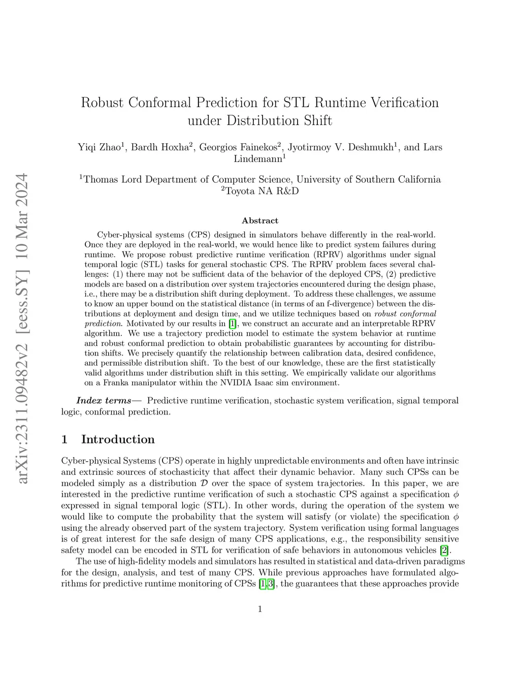 Cyber-physical systems (CPS) designed in simulators behave differently in the real-world. Once they are deployed in the real-world, we would hence like to predict system failures during runtime. We propose robust predictive runtime verification (RPRV) algorithms under signal temporal logic (STL) tasks for general stochastic CPS. The RPRV problem faces several challenges: (1) there may not be sufficient data of the behavior of the deployed CPS, (2) predictive models are based on a distribution over system trajectories encountered during the design phase, i.e., there may be a distribution shift during deployment. To address these challenges, we assume to know an upper bound on the statistical distance (in terms of an f-divergence) between the distributions at deployment and design time, and we utilize techniques based on robust conformal prediction. Motivated by our results in [1], we construct an accurate and an interpretable RPRV algorithm. We use a trajectory prediction model to estimate the system behavior at runtime and robust conformal prediction to obtain probabilistic guarantees by accounting for distribution shifts. We precisely quantify the relationship between calibration data, desired confidence, and permissible distribution shift. To the best of our knowledge, these are the first statistically valid algorithms under distribution shift in this setting. We empirically validate our algorithms on a Franka manipulator within the NVIDIA Isaac sim environment.