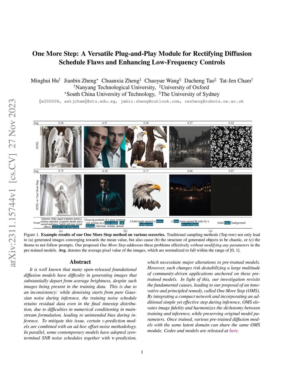 It is well known that many open-released foundational diffusion models have difficulty in generating images that substantially depart from average brightness, despite such images being present in the training data. This is due to an inconsistency: while denoising starts from pure Gaussian noise during inference, the training noise schedule retains residual data even in the final timestep distribution, due to difficulties in numerical conditioning in mainstream formulation, leading to unintended bias during inference. To mitigate this issue, certain -prediction models are combined with an ad-hoc offset-noise methodology. In parallel, some contemporary models have adopted zero-terminal SNR noise schedules together with -prediction, which necessitate major alterations to pre-trained models. However, such changes risk destabilizing a large multitude of community-driven applications anchored on these pre-trained models. In light of this, our investigation revisits the fundamental causes, leading to our proposal of an innovative and principled remedy, called One More Step (OMS). By integrating a compact network and incorporating an additional simple yet effective step during inference, OMS elevates image fidelity and harmonizes the dichotomy between training and inference, while preserving original model parameters. Once trained, various pre-trained diffusion models with the same latent domain can share the same OMS module.