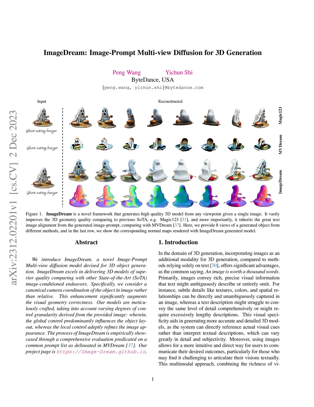 We introduce "ImageDream," an innovative image-prompt, multi-view diffusion model for 3D object generation. ImageDream stands out for its ability to produce 3D models of higher quality compared to existing state-of-the-art, image-conditioned methods. Our approach utilizes a canonical camera coordination for the objects in images, improving visual geometry accuracy. The model is designed with various levels of control at each block inside the diffusion model based on the input image, where global control shapes the overall object layout and local control fine-tunes the image details. The effectiveness of ImageDream is demonstrated through extensive evaluations using a standard prompt list. For more information, visit our project page at https://Image-Dream.github.io.