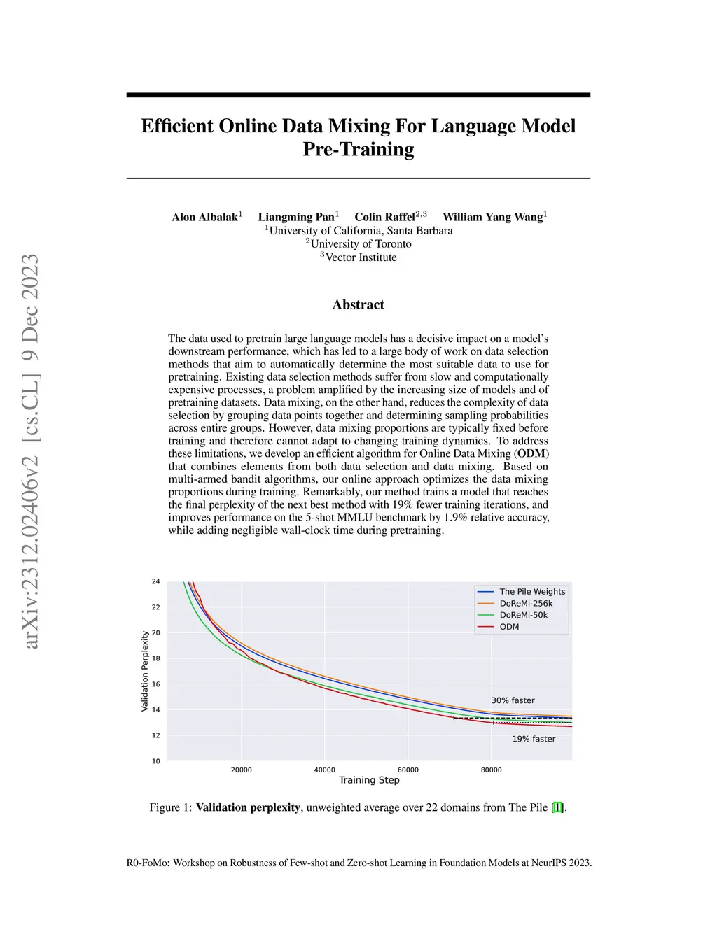 The data used to pretrain large language models has a decisive impact on a model's downstream performance, which has led to a large body of work on data selection methods that aim to automatically determine the most suitable data to use for pretraining. Existing data selection methods suffer from slow and computationally expensive processes, a problem amplified by the increasing size of models and of pretraining datasets. Data mixing, on the other hand, reduces the complexity of data selection by grouping data points together and determining sampling probabilities across entire groups. However, data mixing proportions are typically fixed before training and therefore cannot adapt to changing training dynamics. To address these limitations, we develop an efficient algorithm for Online Data Mixing (ODM) that combines elements from both data selection and data mixing. Based on multi-armed bandit algorithms, our online approach optimizes the data mixing proportions during training. Remarkably, our method trains a model that reaches the final perplexity of the next best method with 19\% fewer training iterations, and improves performance on the 5-shot MMLU benchmark by 1.9% relative accuracy, while adding negligible wall-clock time during pretraining.