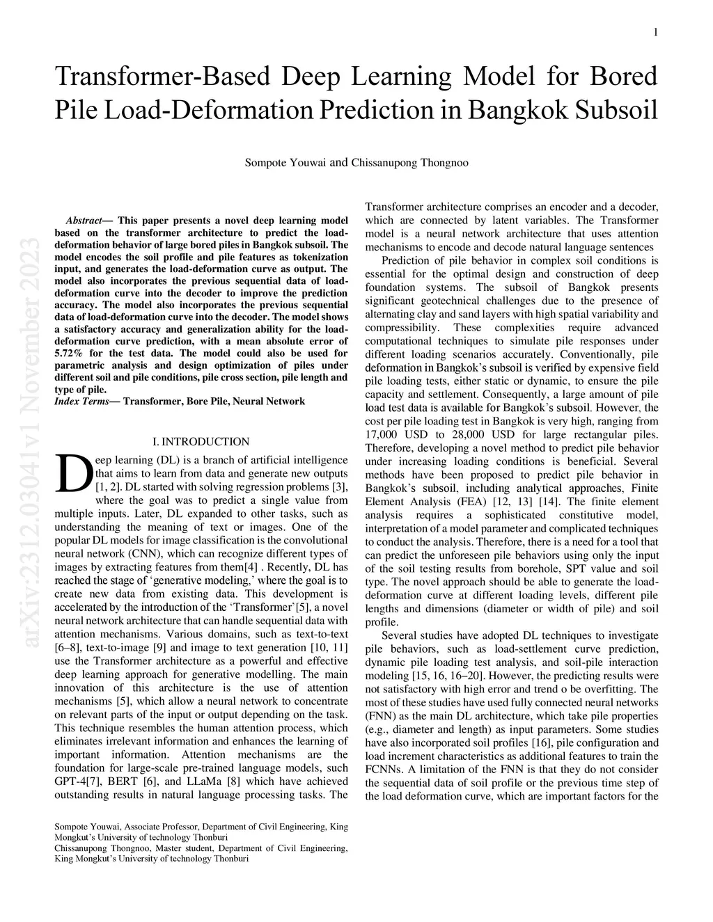 This paper presents a novel deep learning model based on the transformer architecture to predict the load-deformation behavior of large bored piles in Bangkok subsoil. The model encodes the soil profile and pile features as tokenization input, and generates the load-deformation curve as output. The model also incorporates the previous sequential data of load-deformation curve into the decoder to improve the prediction accuracy. The model also incorporates the previous sequential data of load-deformation curve into the decoder. The model shows a satisfactory accuracy and generalization ability for the load-deformation curve prediction, with a mean absolute error of 5.72% for the test data. The model could also be used for parametric analysis and design optimization of piles under different soil and pile conditions, pile cross section, pile length and type of pile.