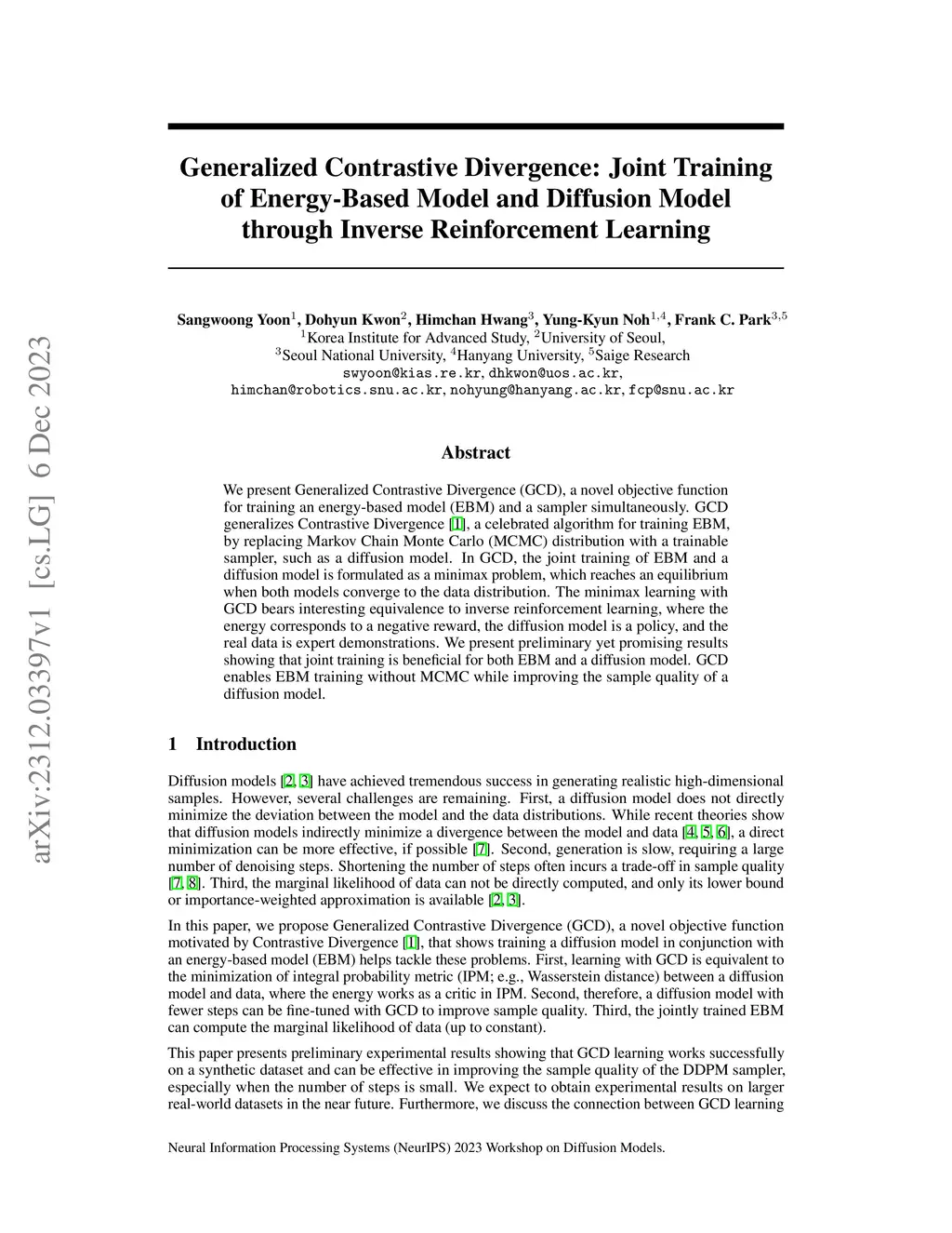 We present Generalized Contrastive Divergence (GCD), a novel objective function for training an energy-based model (EBM) and a sampler simultaneously. GCD generalizes Contrastive Divergence (Hinton, 2002), a celebrated algorithm for training EBM, by replacing Markov Chain Monte Carlo (MCMC) distribution with a trainable sampler, such as a diffusion model. In GCD, the joint training of EBM and a diffusion model is formulated as a minimax problem, which reaches an equilibrium when both models converge to the data distribution. The minimax learning with GCD bears interesting equivalence to inverse reinforcement learning, where the energy corresponds to a negative reward, the diffusion model is a policy, and the real data is expert demonstrations. We present preliminary yet promising results showing that joint training is beneficial for both EBM and a diffusion model. GCD enables EBM training without MCMC while improving the sample quality of a diffusion model.