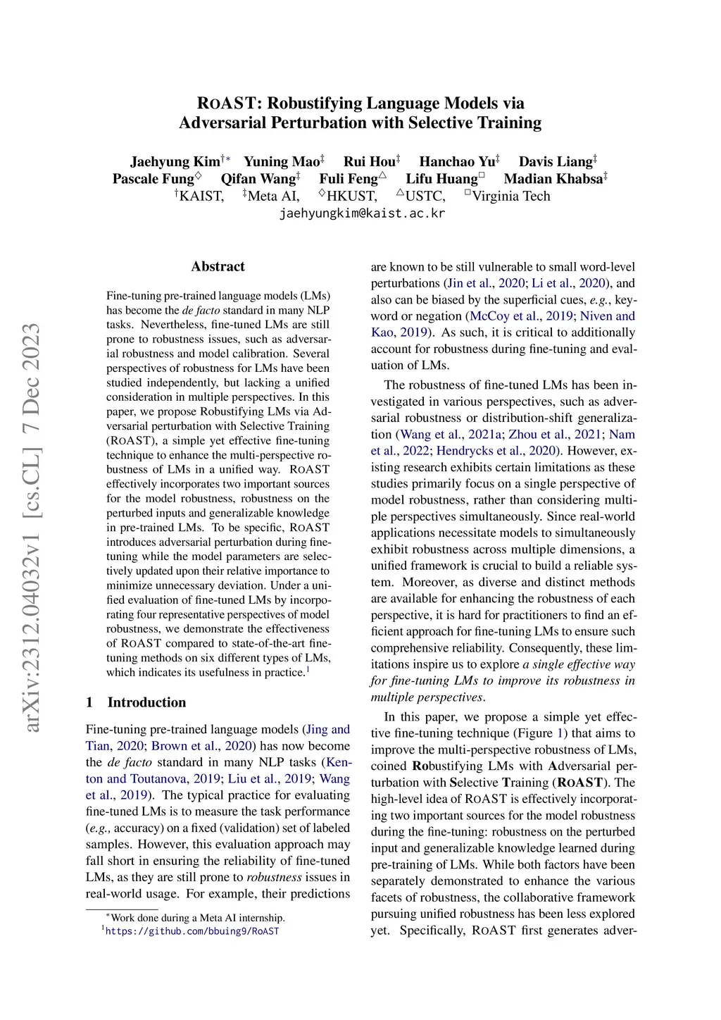 RoAST: Robustifying Language Models via Adversarial Perturbation with