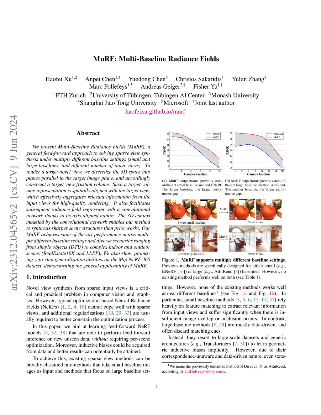 We present Multi-Baseline Radiance Fields (MuRF), a general feed-forward approach to solving sparse view synthesis under multiple different baseline settings (small and large baselines, and different number of input views). To render a target novel view, we discretize the 3D space into planes parallel to the target image plane, and accordingly construct a target view frustum volume. Such a target volume representation is spatially aligned with the target view, which effectively aggregates relevant information from the input views for high-quality rendering. It also facilitates subsequent radiance field regression with a convolutional network thanks to its axis-aligned nature. The 3D context modeled by the convolutional network enables our method to synthesis sharper scene structures than prior works. Our MuRF achieves state-of-the-art performance across multiple different baseline settings and diverse scenarios ranging from simple objects (DTU) to complex indoor and outdoor scenes (RealEstate10K and LLFF). We also show promising zero-shot generalization abilities on the Mip-NeRF 360 dataset, demonstrating the general applicability of MuRF.