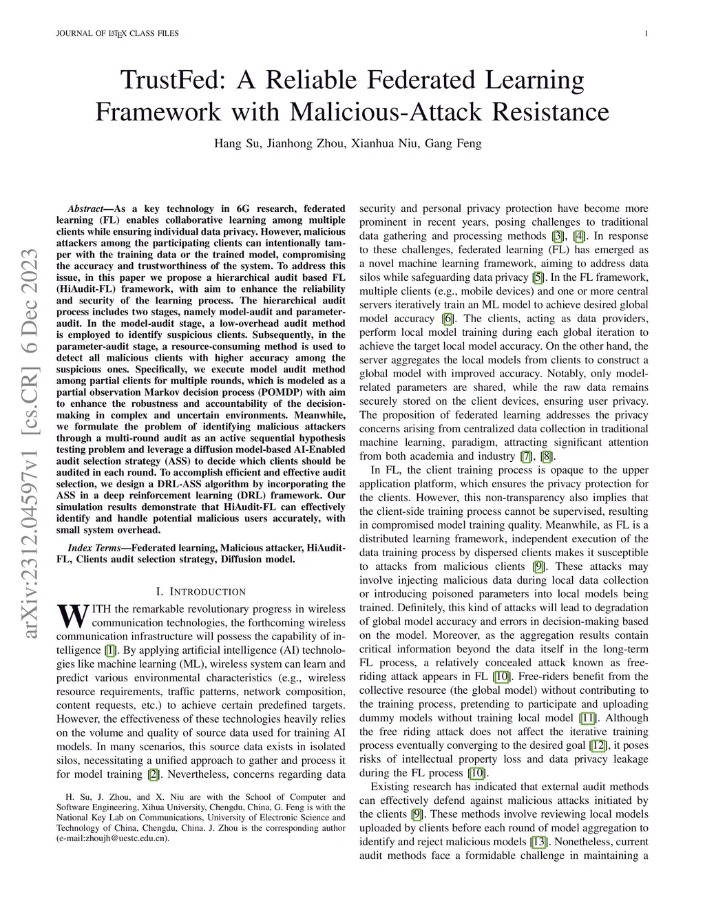 As a key technology in 6G research, federated learning (FL) enables collaborative learning among multiple clients while ensuring individual data privacy. However, malicious attackers among the participating clients can intentionally tamper with the training data or the trained model, compromising the accuracy and trustworthiness of the system. To address this issue, in this paper, we propose a hierarchical audit-based FL (HiAudit-FL) framework, with the aim to enhance the reliability and security of the learning process. The hierarchical audit process includes two stages, namely model-audit and parameter-audit. In the model-audit stage, a low-overhead audit method is employed to identify suspicious clients. Subsequently, in the parameter-audit stage, a resource-consuming method is used to detect all malicious clients with higher accuracy among the suspicious ones. Specifically, we execute the model audit method among partial clients for multiple rounds, which is modeled as a partial observation Markov decision process (POMDP) with the aim to enhance the robustness and accountability of the decision-making in complex and uncertain environments. Meanwhile, we formulate the problem of identifying malicious attackers through a multi-round audit as an active sequential hypothesis testing problem and leverage a diffusion model-based AI-Enabled audit selection strategy (ASS) to decide which clients should be audited in each round. To accomplish efficient and effective audit selection, we design a DRL-ASS algorithm by incorporating the ASS in a deep reinforcement learning (DRL) framework. Our simulation results demonstrate that HiAudit-FL can effectively identify and handle potential malicious users accurately, with small system overhead.