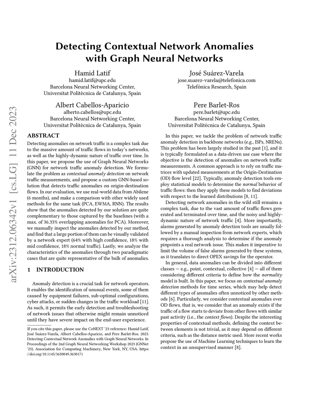 Detecting anomalies on network traffic is a complex task due to the massive amount of traffic flows in today's networks, as well as the highly-dynamic nature of traffic over time. In this paper, we propose the use of Graph Neural Networks (GNN) for network traffic anomaly detection. We formulate the problem as contextual anomaly detection on network traffic measurements, and propose a custom GNN-based solution that detects traffic anomalies on origin-destination flows. In our evaluation, we use real-world data from Abilene (6 months), and make a comparison with other widely used methods for the same task (PCA, EWMA, RNN). The results show that the anomalies detected by our solution are quite complementary to those captured by the baselines (with a max. of 36.33% overlapping anomalies for PCA). Moreover, we manually inspect the anomalies detected by our method, and find that a large portion of them can be visually validated by a network expert (64% with high confidence, 18% with mid confidence, 18% normal traffic). Lastly, we analyze the characteristics of the anomalies through two paradigmatic cases that are quite representative of the bulk of anomalies.