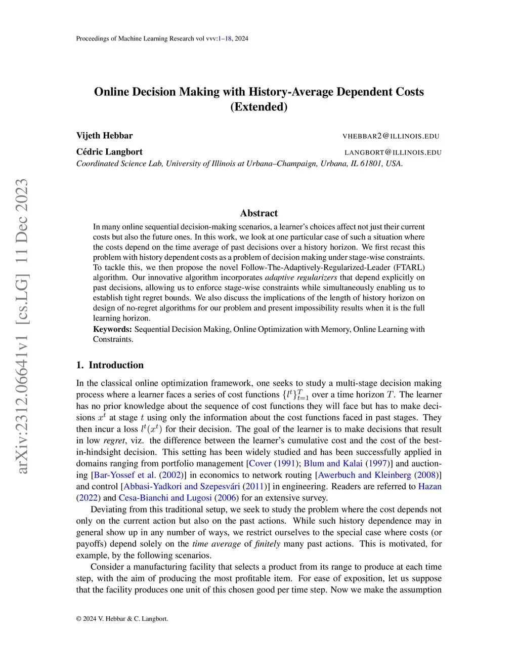 In many online sequential decision-making scenarios, a learner's choices affect not just their current costs but also the future ones. In this work, we look at one particular case of such a situation where the costs depend on the time average of past decisions over a history horizon. We first recast this problem with history dependent costs as a problem of decision making under stage-wise constraints. To tackle this, we then propose the novel Follow-The-Adaptively-Regularized-Leader (FTARL) algorithm. Our innovative algorithm incorporates adaptive regularizers that depend explicitly on past decisions, allowing us to enforce stage-wise constraints while simultaneously enabling us to establish tight regret bounds. We also discuss the implications of the length of history horizon on design of no-regret algorithms for our problem and present impossibility results when it is the full learning horizon.