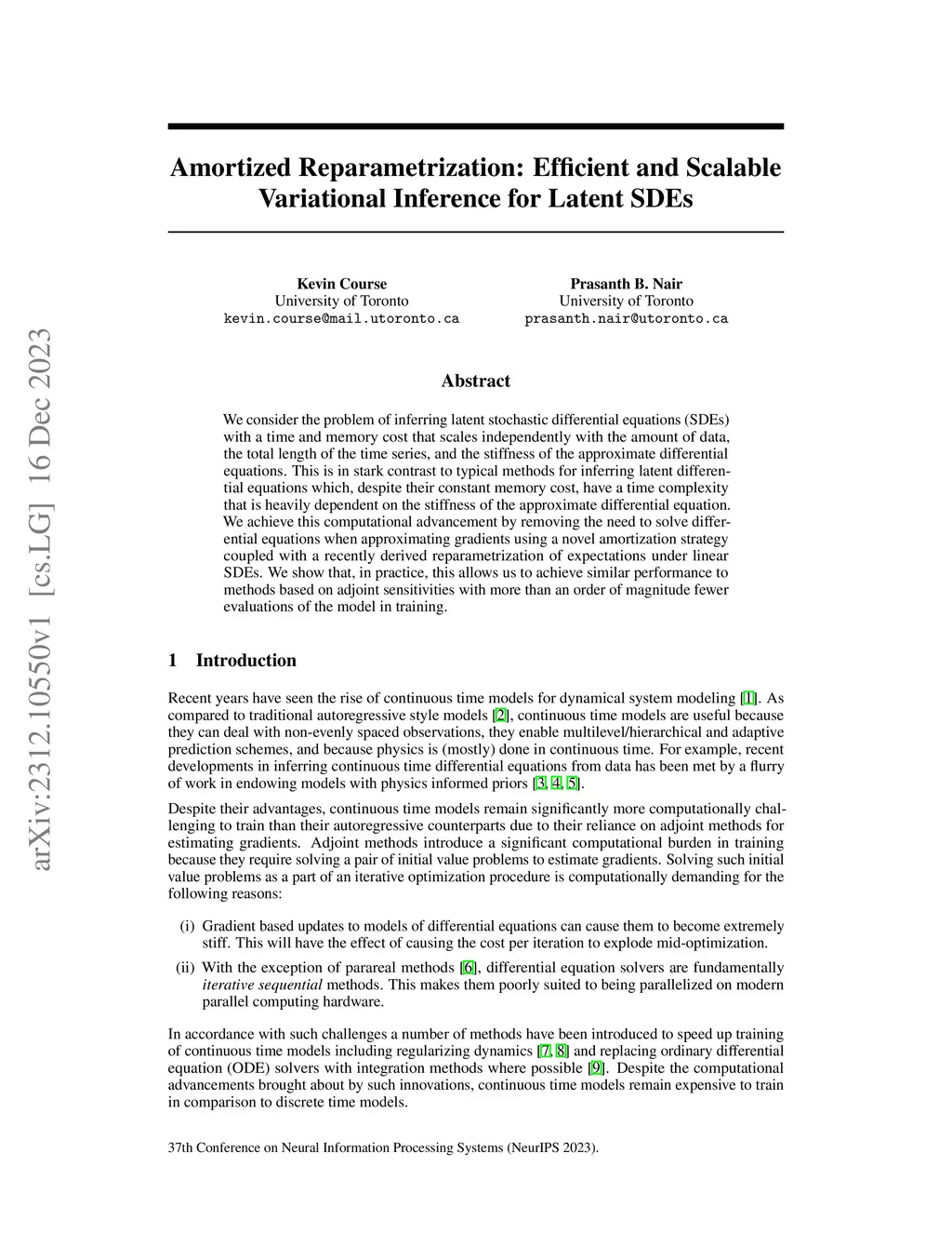 We consider the problem of inferring latent stochastic differential equations (SDEs) with a time and memory cost that scales independently with the amount of data, the total length of the time series, and the stiffness of the approximate differential equations. This is in stark contrast to typical methods for inferring latent differential equations which, despite their constant memory cost, have a time complexity that is heavily dependent on the stiffness of the approximate differential equation. We achieve this computational advancement by removing the need to solve differential equations when approximating gradients using a novel amortization strategy coupled with a recently derived reparametrization of expectations under linear SDEs. We show that, in practice, this allows us to achieve similar performance to methods based on adjoint sensitivities with more than an order of magnitude fewer evaluations of the model in training.