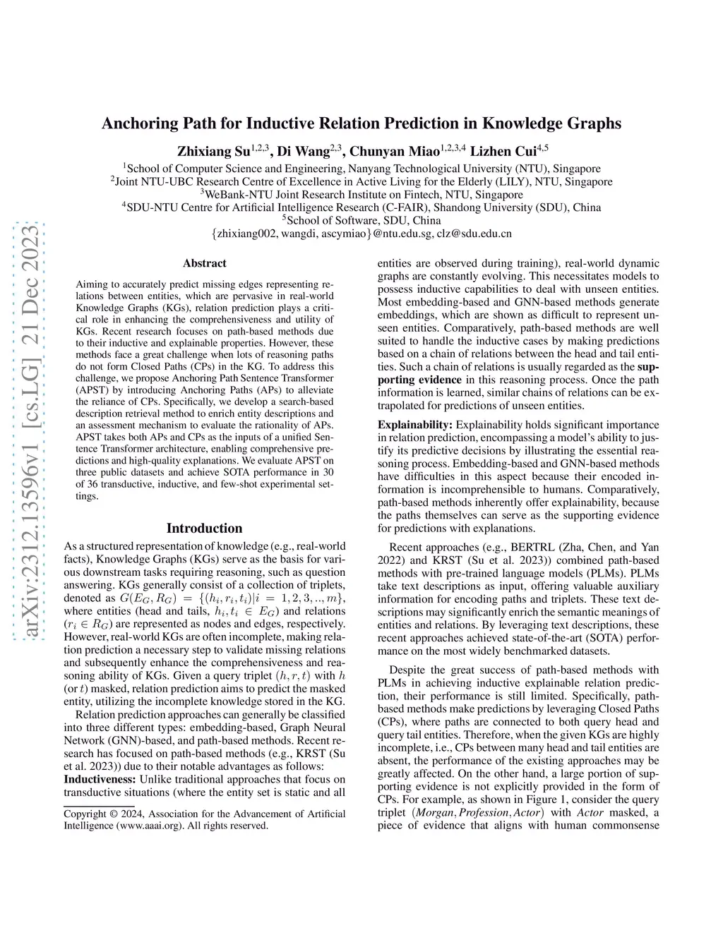 Aiming to accurately predict missing edges representing relations between entities, which are pervasive in real-world Knowledge Graphs (KGs), relation prediction plays a critical role in enhancing the comprehensiveness and utility of KGs. Recent research focuses on path-based methods due to their inductive and explainable properties. However, these methods face a great challenge when lots of reasoning paths do not form Closed Paths (CPs) in the KG. To address this challenge, we propose Anchoring Path Sentence Transformer (APST) by introducing Anchoring Paths (APs) to alleviate the reliance of CPs. Specifically, we develop a search-based description retrieval method to enrich entity descriptions and an assessment mechanism to evaluate the rationality of APs. APST takes both APs and CPs as the inputs of a unified Sentence Transformer architecture, enabling comprehensive predictions and high-quality explanations. We evaluate APST on three public datasets and achieve state-of-the-art (SOTA) performance in 30 of 36 transductive, inductive, and few-shot experimental settings.