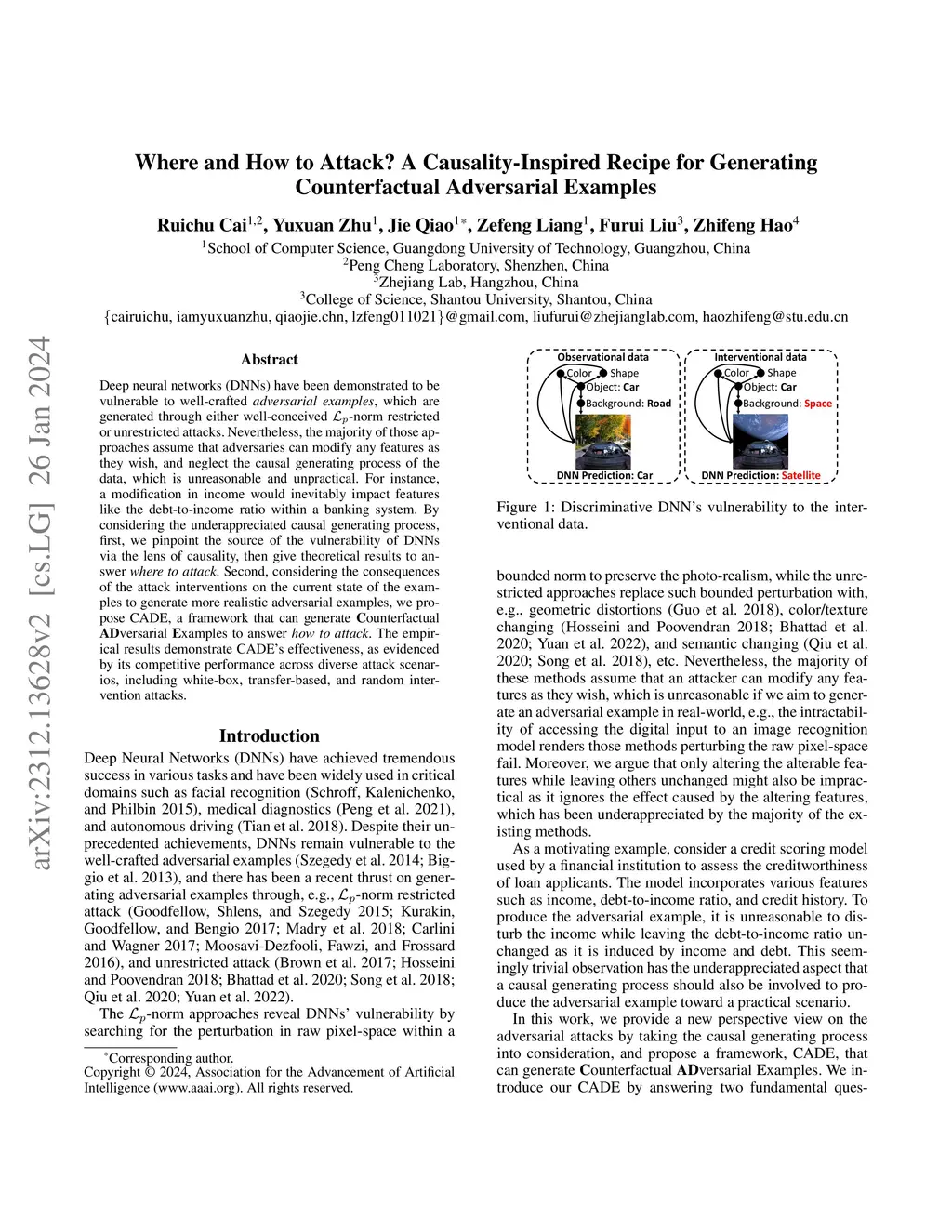 Deep neural networks (DNNs) have been demonstrated to be vulnerable to well-crafted \emph{adversarial examples}, which are generated through either well-conceived -norm restricted or unrestricted attacks. Nevertheless, the majority of those approaches assume that adversaries can modify any features as they wish, and neglect the causal generating process of the data, which is unreasonable and unpractical. For instance, a modification in income would inevitably impact features like the debt-to-income ratio within a banking system. By considering the underappreciated causal generating process, first, we pinpoint the source of the vulnerability of DNNs via the lens of causality, then give theoretical results to answer \emph{where to attack}. Second, considering the consequences of the attack interventions on the current state of the examples to generate more realistic adversarial examples, we propose CADE, a framework that can generate \textbf{C}ounterfactual \textbf{AD}versarial \textbf{E}xamples to answer \emph{how to attack}. The empirical results demonstrate CADE's effectiveness, as evidenced by its competitive performance across diverse attack scenarios, including white-box, transfer-based, and random intervention attacks.