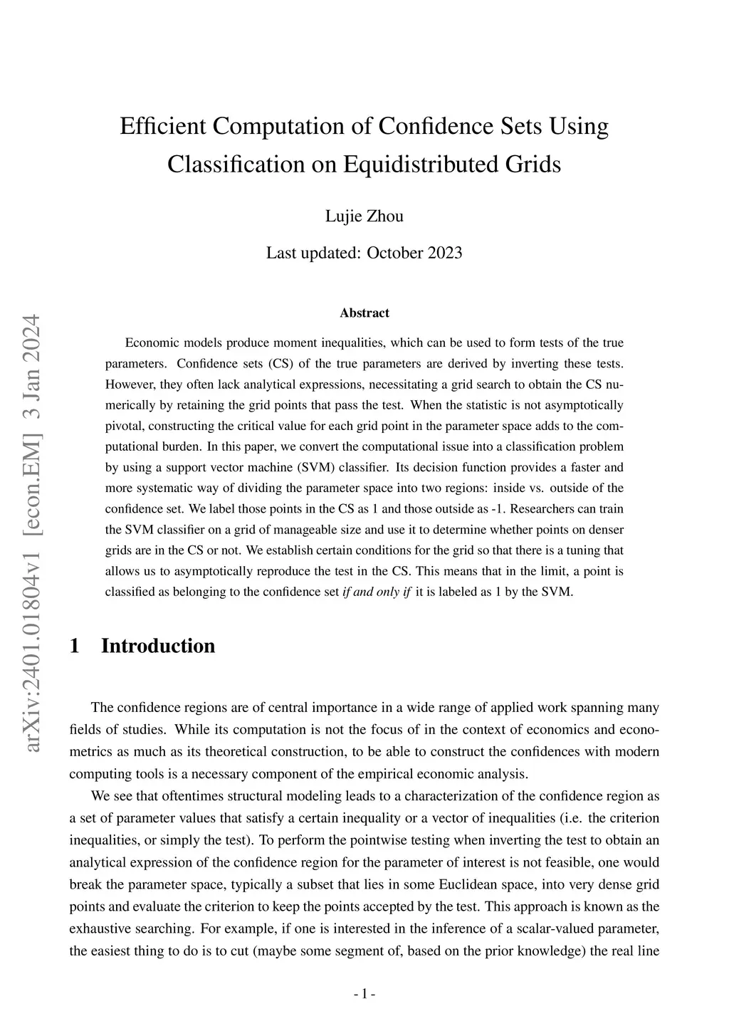 Economic models produce moment inequalities, which can be used to form tests of the true parameters. Confidence sets (CS) of the true parameters are derived by inverting these tests. However, they often lack analytical expressions, necessitating a grid search to obtain the CS numerically by retaining the grid points that pass the test. When the statistic is not asymptotically pivotal, constructing the critical value for each grid point in the parameter space adds to the computational burden. In this paper, we convert the computational issue into a classification problem by using a support vector machine (SVM) classifier. Its decision function provides a faster and more systematic way of dividing the parameter space into two regions: inside vs. outside of the confidence set. We label those points in the CS as 1 and those outside as -1. Researchers can train the SVM classifier on a grid of manageable size and use it to determine whether points on denser grids are in the CS or not. We establish certain conditions for the grid so that there is a tuning that allows us to asymptotically reproduce the test in the CS. This means that in the limit, a point is classified as belonging to the confidence set if and only if it is labeled as 1 by the SVM.