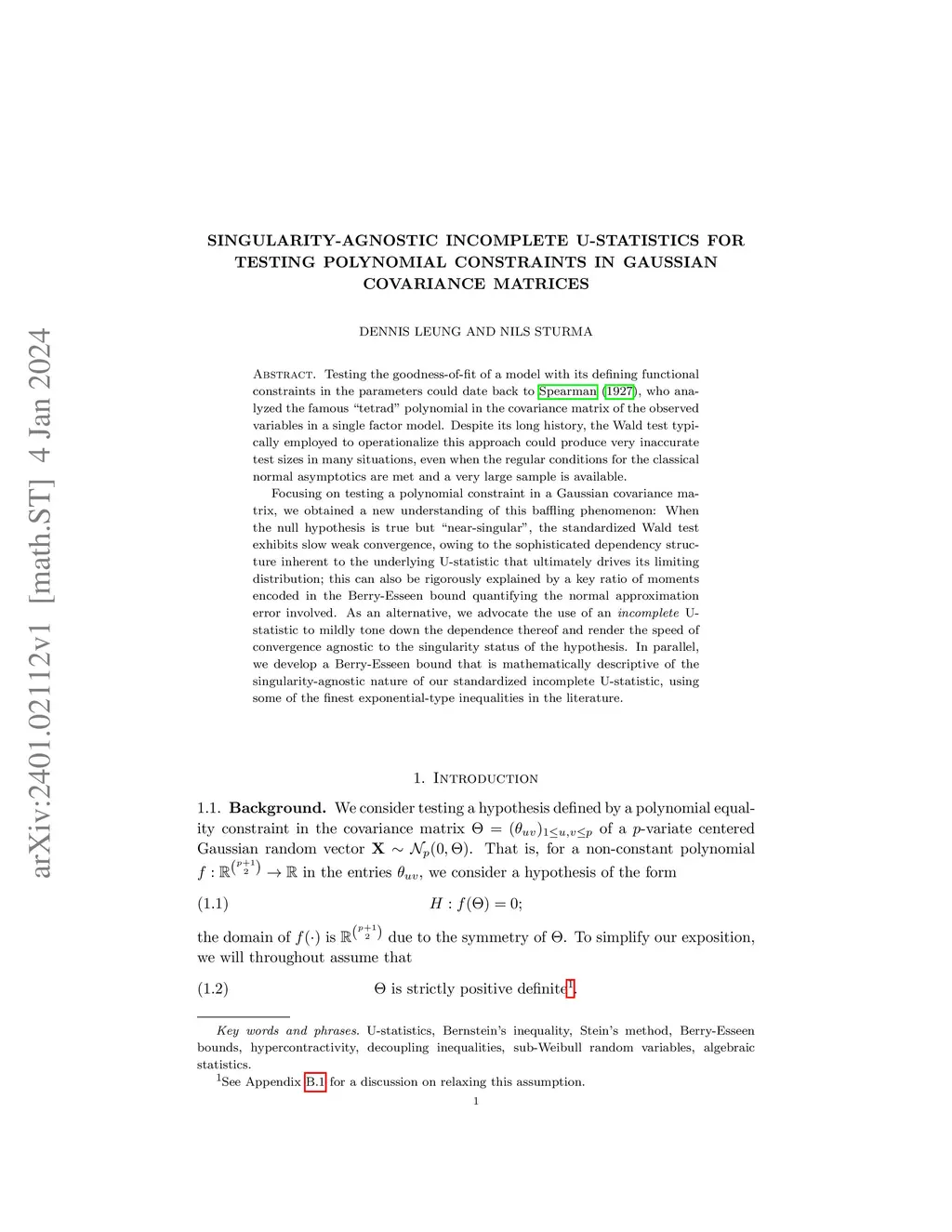 Testing the goodness-of-fit of a model with its defining functional constraints in the parameters could date back to Spearman (1927), who analyzed the famous "tetrad" polynomial in the covariance matrix of the observed variables in a single-factor model. Despite its long history, the Wald test typically employed to operationalize this approach could produce very inaccurate test sizes in many situations, even when the regular conditions for the classical normal asymptotics are met and a very large sample is available. Focusing on testing a polynomial constraint in a Gaussian covariance matrix, we obtained a new understanding of this baffling phenomenon: When the null hypothesis is true but "near-singular", the standardized Wald test exhibits slow weak convergence, owing to the sophisticated dependency structure inherent to the underlying U-statistic that ultimately drives its limiting distribution; this can also be rigorously explained by a key ratio of moments encoded in the Berry-Esseen bound quantifying the normal approximation error involved. As an alternative, we advocate the use of an incomplete U-statistic to mildly tone down the dependence thereof and render the speed of convergence agnostic to the singularity status of the hypothesis. In parallel, we develop a Berry-Esseen bound that is mathematically descriptive of the singularity-agnostic nature of our standardized incomplete U-statistic, using some of the finest exponential-type inequalities in the literature.