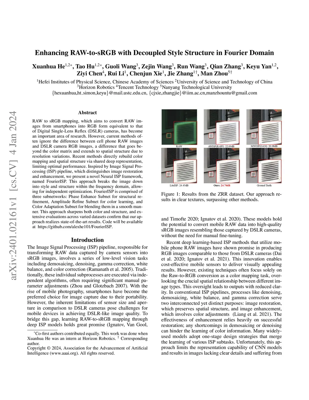 RAW to sRGB mapping, which aims to convert RAW images from smartphones into RGB form equivalent to that of Digital Single-Lens Reflex (DSLR) cameras, has become an important area of research. However, current methods often ignore the difference between cell phone RAW images and DSLR camera RGB images, a difference that goes beyond the color matrix and extends to spatial structure due to resolution variations. Recent methods directly rebuild color mapping and spatial structure via shared deep representation, limiting optimal performance. Inspired by Image Signal Processing (ISP) pipeline, which distinguishes image restoration and enhancement, we present a novel Neural ISP framework, named FourierISP. This approach breaks the image down into style and structure within the frequency domain, allowing for independent optimization. FourierISP is comprised of three subnetworks: Phase Enhance Subnet for structural refinement, Amplitude Refine Subnet for color learning, and Color Adaptation Subnet for blending them in a smooth manner. This approach sharpens both color and structure, and extensive evaluations across varied datasets confirm that our approach realizes state-of-the-art results. Code will be available at ~\url{https://github.com/alexhe101/FourierISP}.