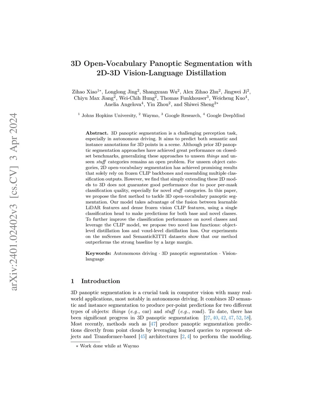 3D panoptic segmentation is a challenging perception task, especially in autonomous driving. It aims to predict both semantic and instance annotations for 3D points in a scene. Although prior 3D panoptic segmentation approaches have achieved great performance on closed-set benchmarks, generalizing these approaches to unseen things and unseen stuff categories remains an open problem. For unseen object categories, 2D open-vocabulary segmentation has achieved promising results that solely rely on frozen CLIP backbones and ensembling multiple classification outputs. However, we find that simply extending these 2D models to 3D does not guarantee good performance due to poor per-mask classification quality, especially for novel stuff categories. In this paper, we propose the first method to tackle 3D open-vocabulary panoptic segmentation. Our model takes advantage of the fusion between learnable LiDAR features and dense frozen vision CLIP features, using a single classification head to make predictions for both base and novel classes. To further improve the classification performance on novel classes and leverage the CLIP model, we propose two novel loss functions: object-level distillation loss and voxel-level distillation loss. Our experiments on the nuScenes and SemanticKITTI datasets show that our method outperforms the strong baseline by a large margin.